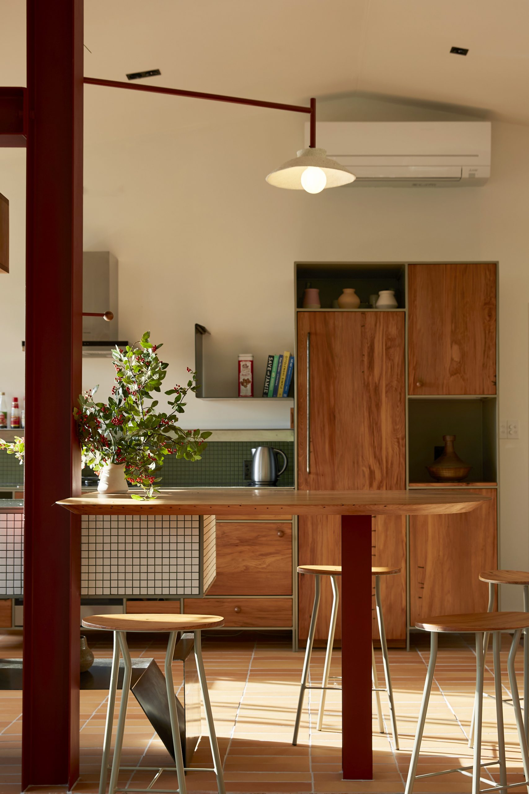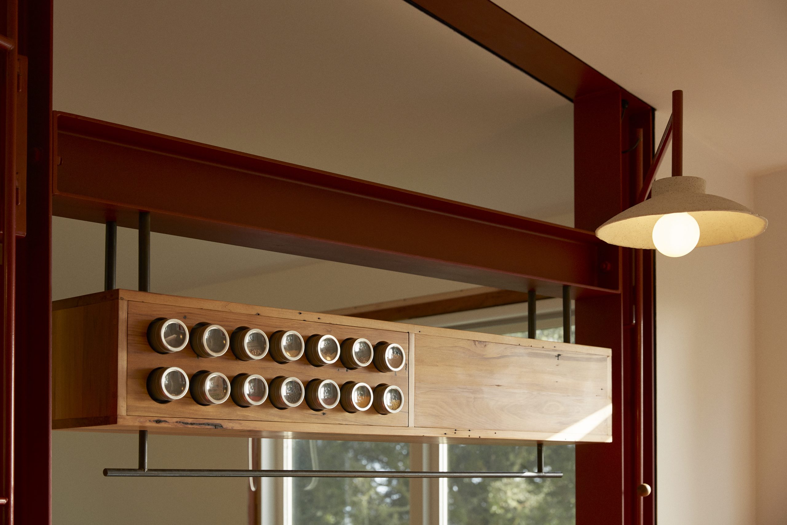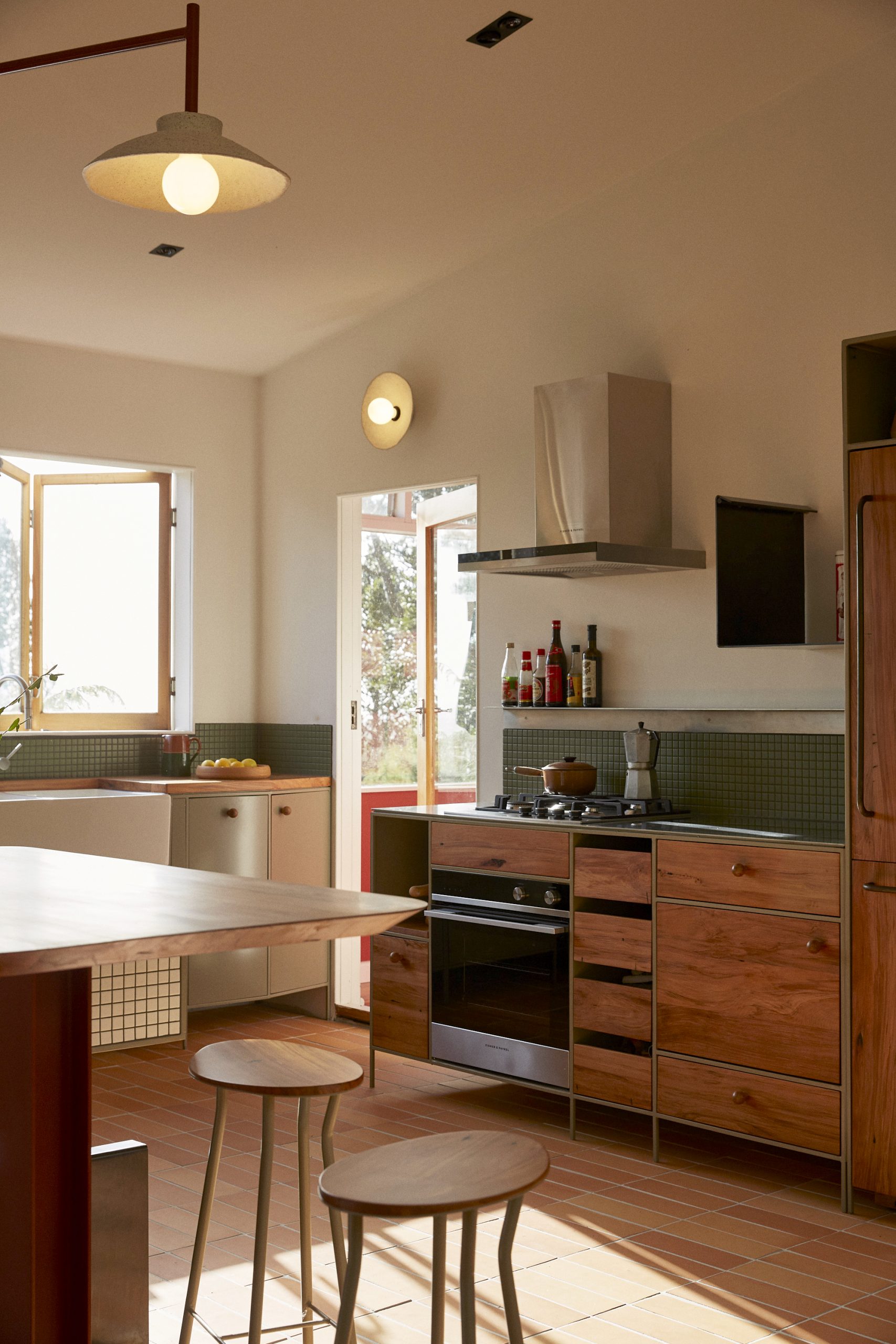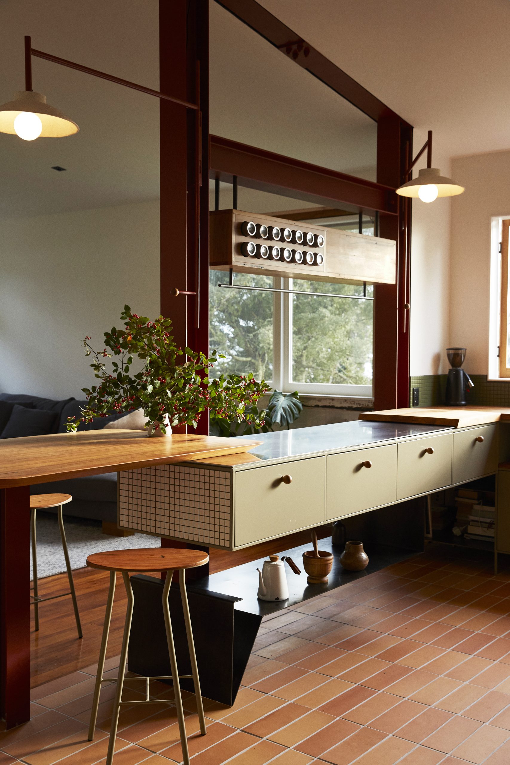 The color scheme draws from the local scenery, with the steel cabinets painted a soft green and deep red highlights that echo the hues of the area’s native trees. The custom-made lampshades, created by Tom Lopes and incorporating black sand in the clay, give a nod to the nearby seashores.