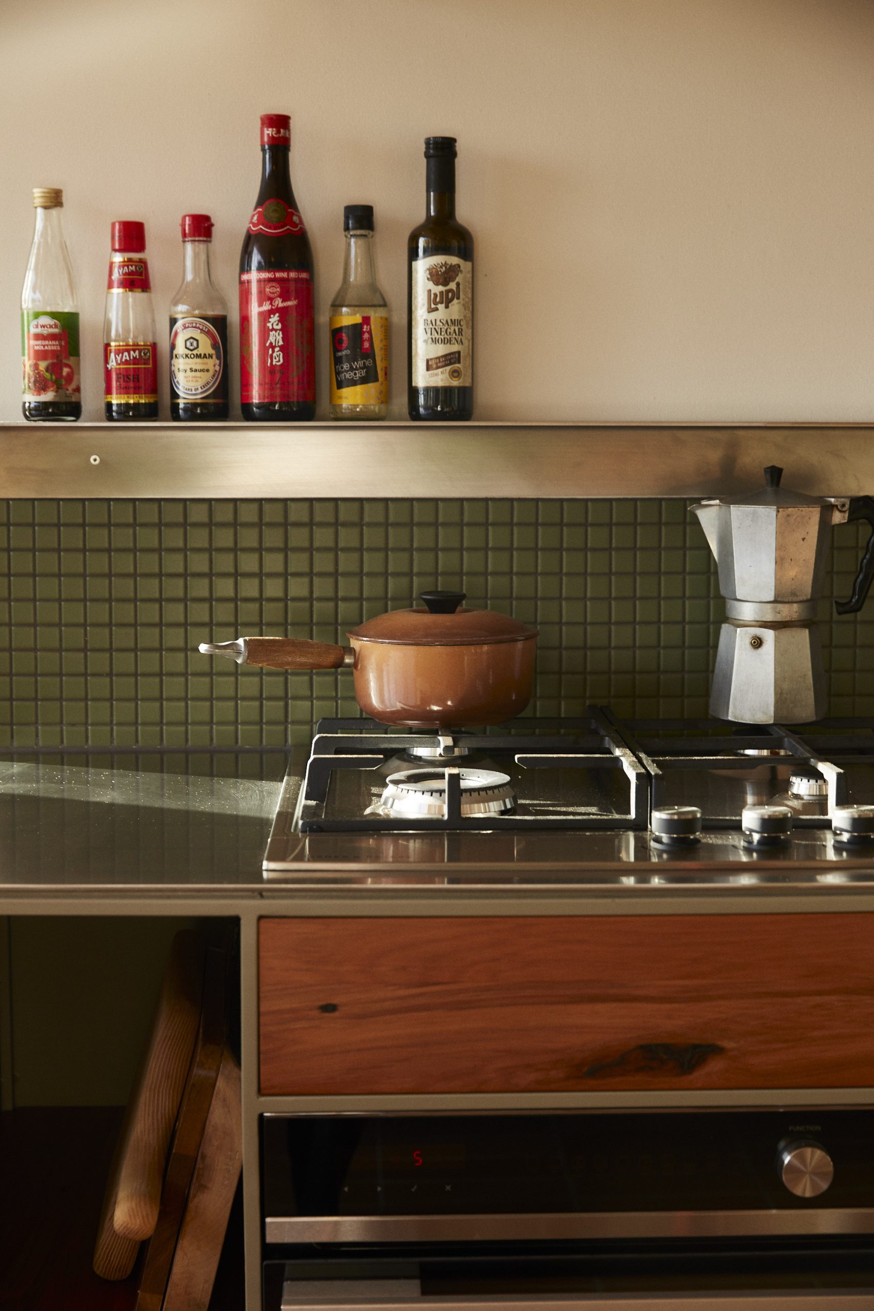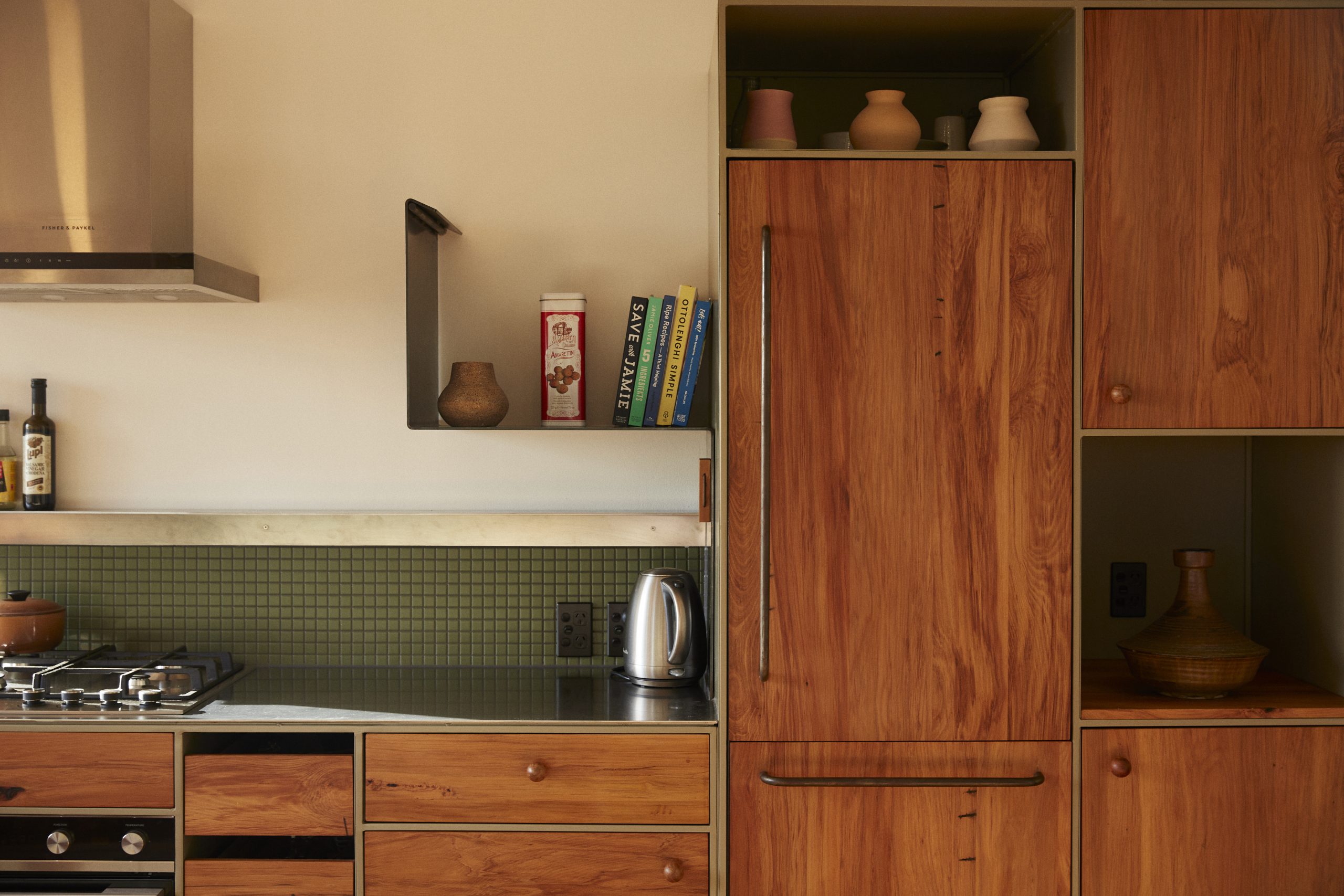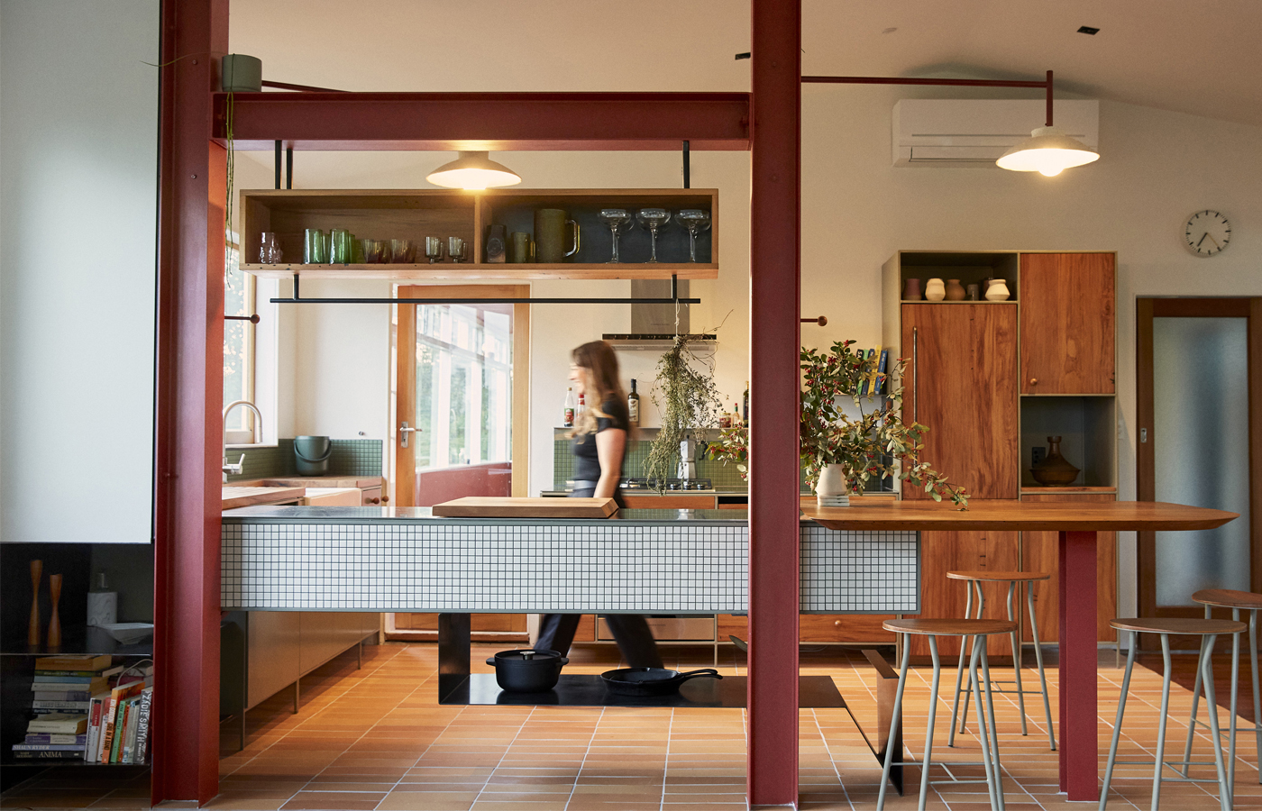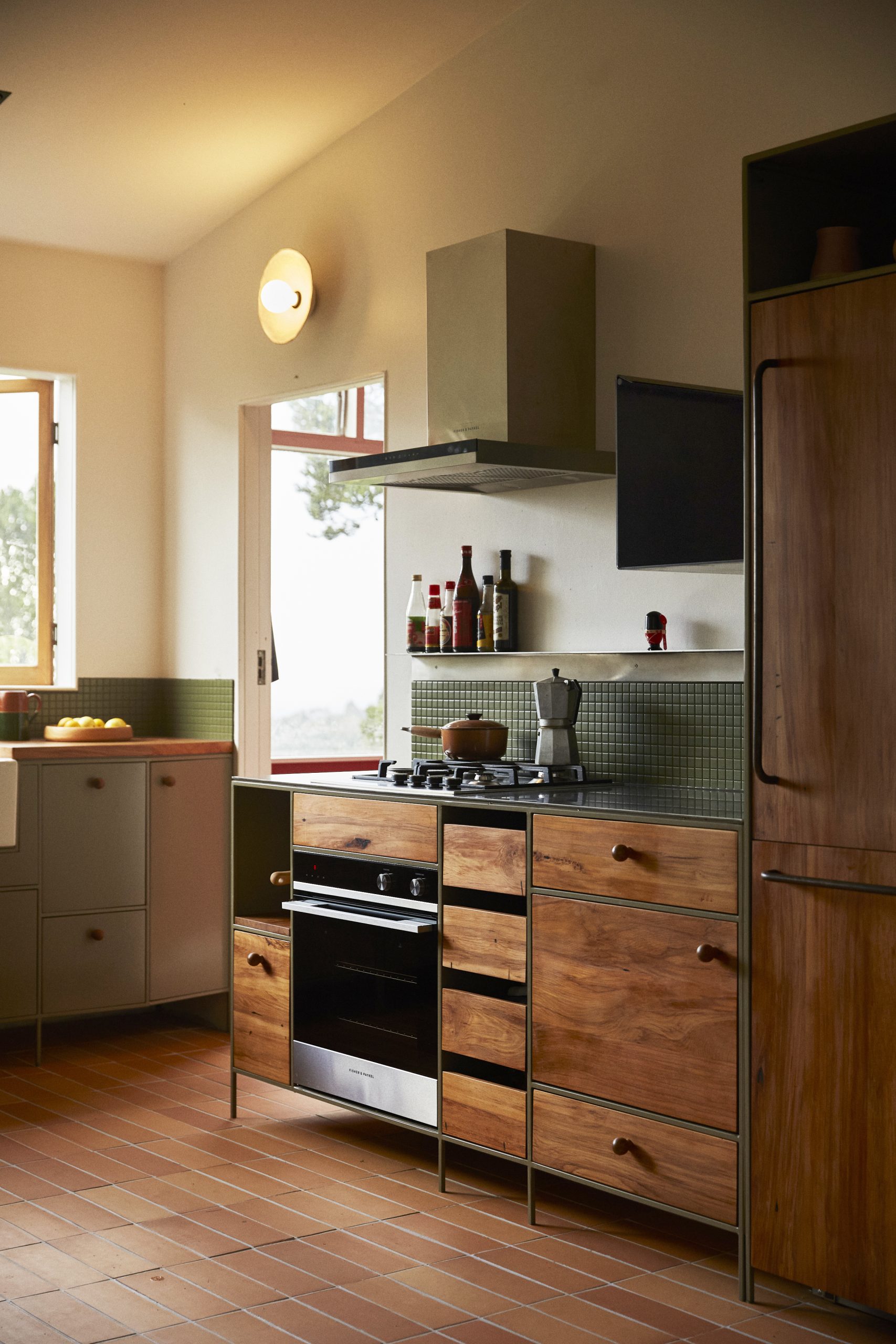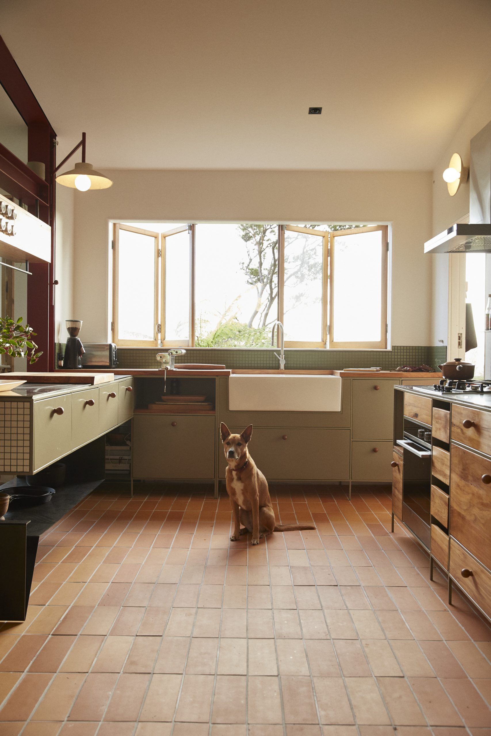 The color scheme draws from the local scenery, with the steel cabinets painted a soft green and deep red highlights that echo the hues of the area’s native trees. The custom-made lampshades, created by Tom Lopes and incorporating black sand in the clay, give a nod to the nearby seashores.