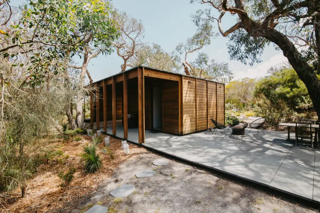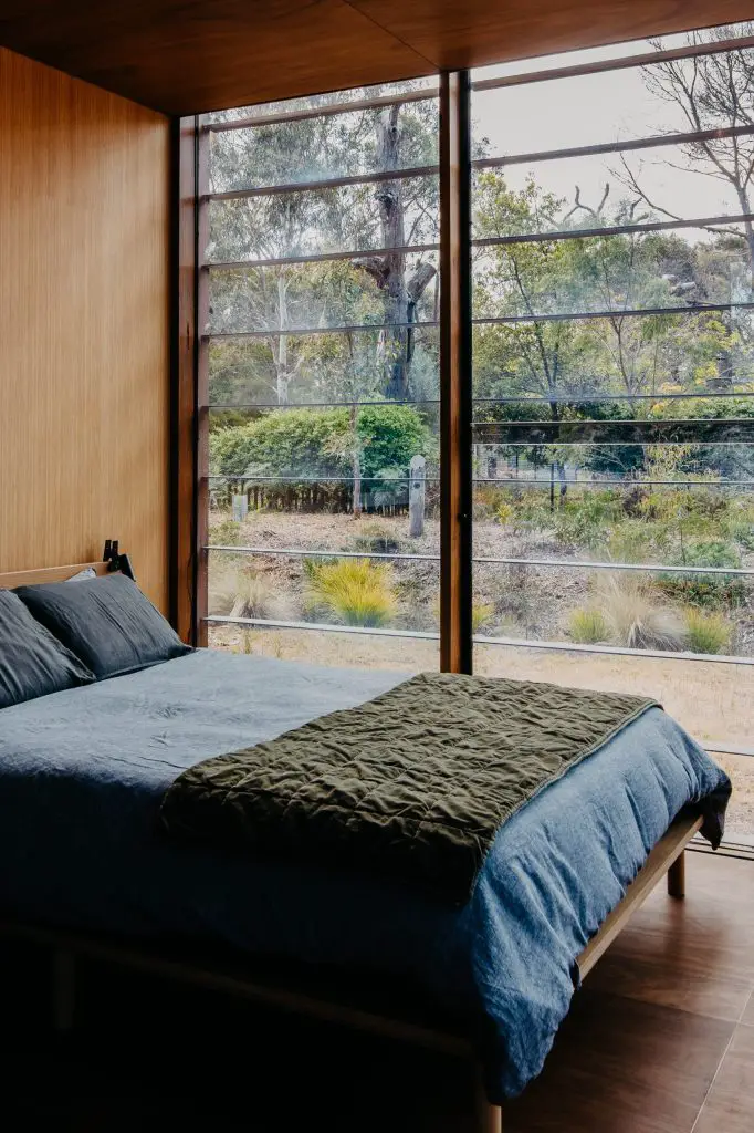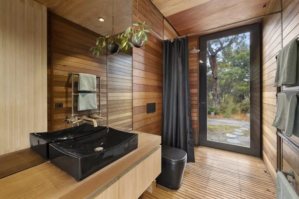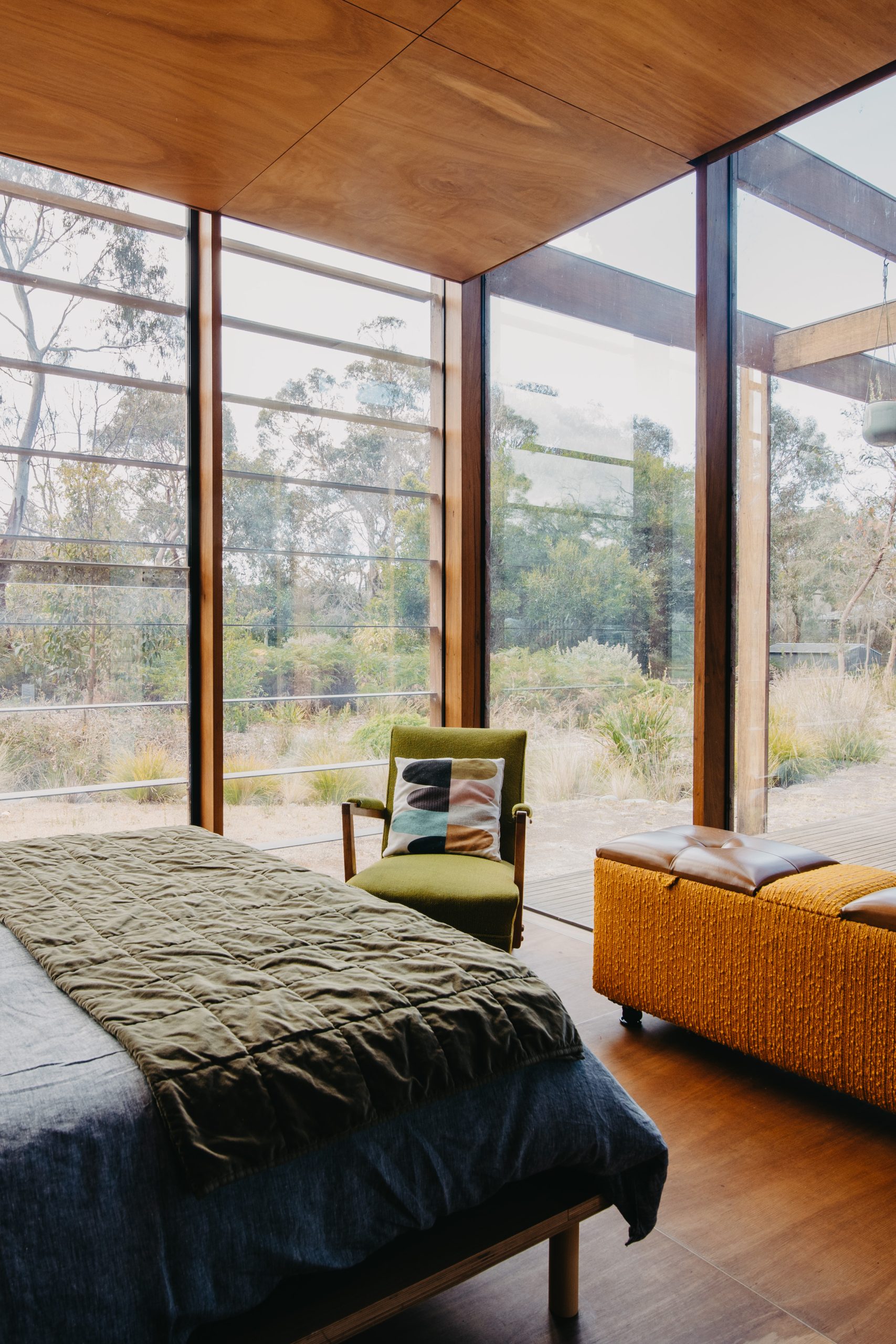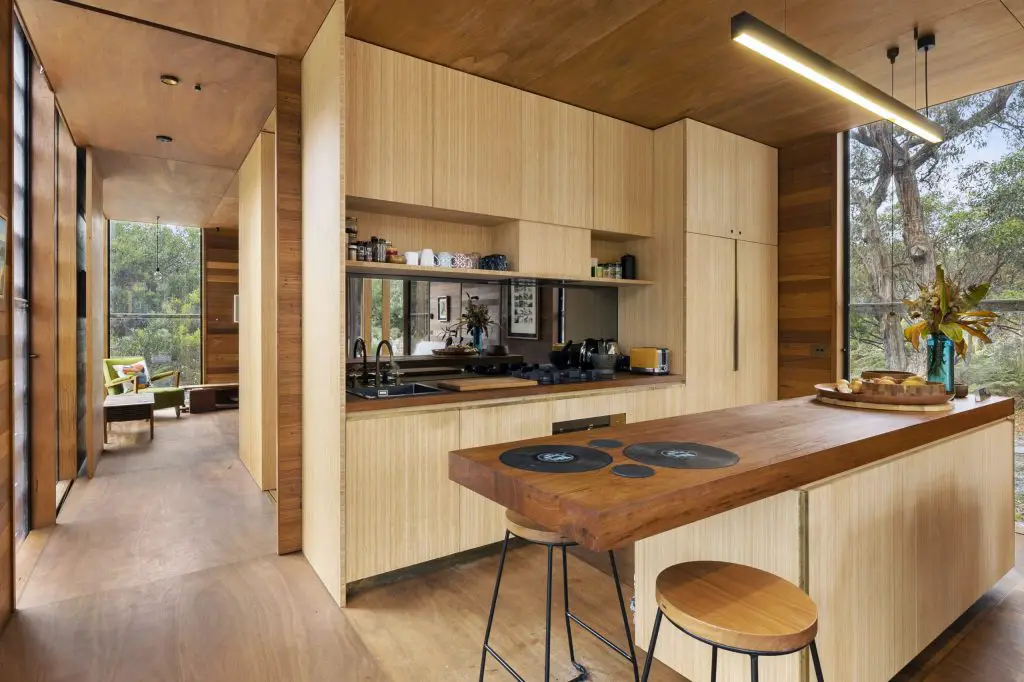 Materials were chosen for their honesty, durability, and warmth. The exterior is clad in 150mm recycled Blackbutt shiplap, expressed in bays by the vertical timber structure. Inside, 100mm Blackbutt lining boards wrap walls in a glow that shifts with the light. Floors and ceilings are crafted from Blackbutt plywood with brass inlays, forming a continuous surface free from plaster or tile.