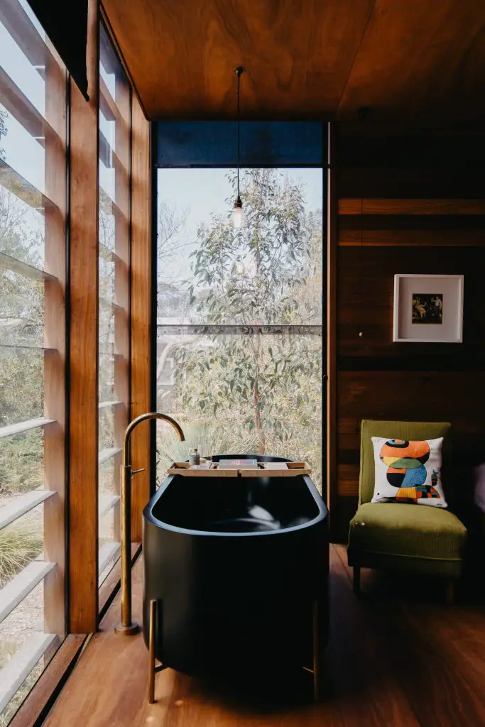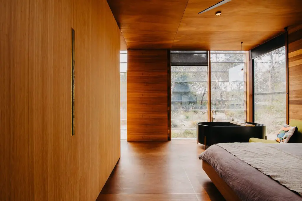 Trades were minimal by design. Kitchens and vanities feature benchtops of the same timber, sealed with natural oils. Bamboo cabinetry, burnished brass fittings, and black-anodized aluminium complete a palette tuned to the landscape, earthy, tactile, and deliberately free of white or chrome.