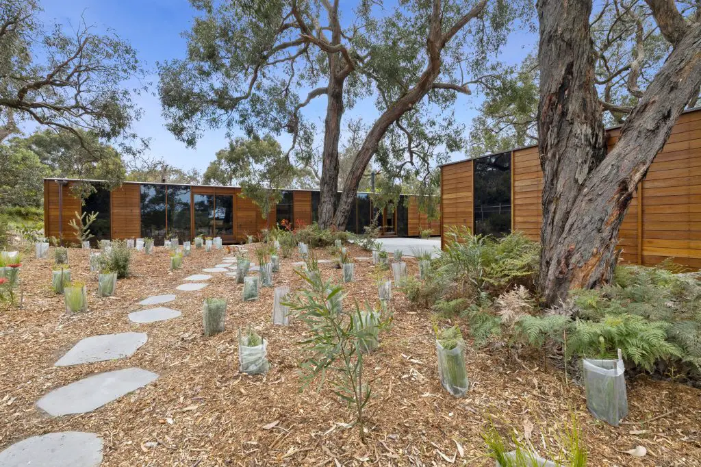 Beyond the architecture, the site continues to shape experience. A swale runs through the rear garden, forming an ephemeral stream in winter that feeds a pond come spring, drawing birds, frogs, and other wildlife. Existing native vegetation was preserved and extended with new plantings: Banksia, Correa, Grevillea, Sheoak, and Wattle.