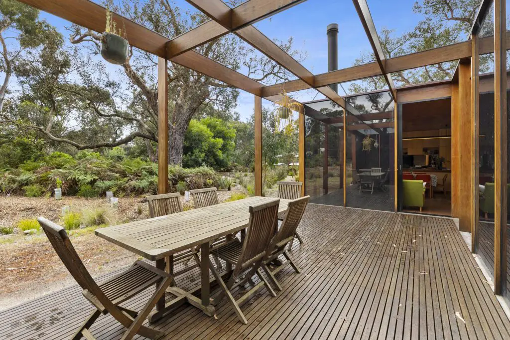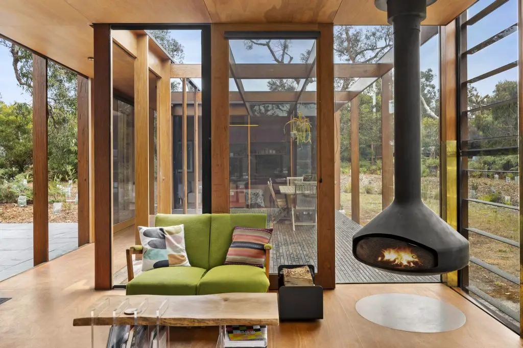 The home reads as an extruded timber box, rhythmically composed and softened by time. Its long, narrow plan stretches along an east-west axis, carefully oriented for solar performance. In winter, sunlight penetrates deep into the floor plate; in summer, gravity-led copper louvres drop to shield interiors from heat.