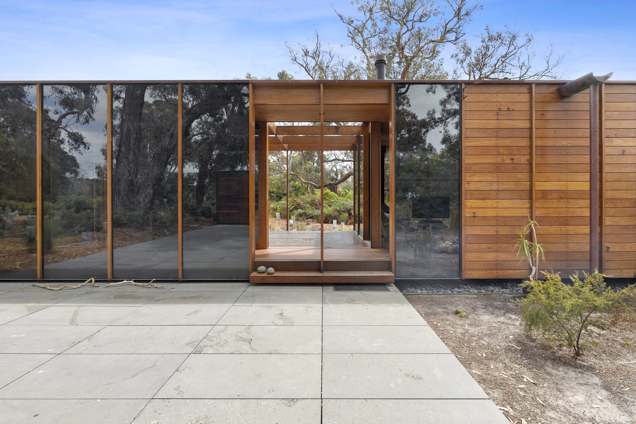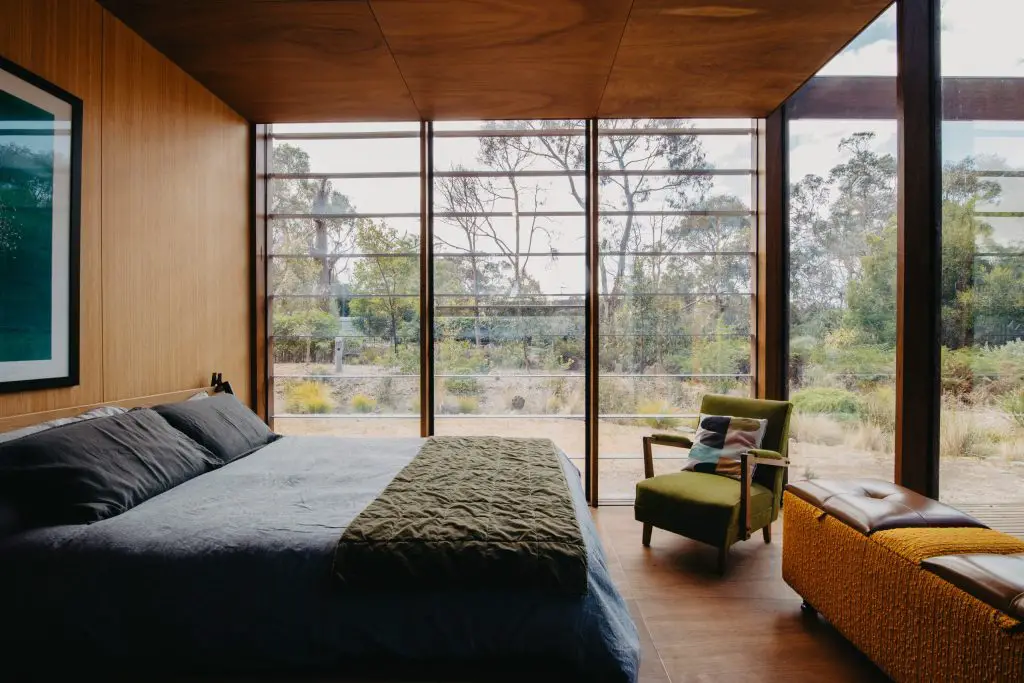 Full-height mirror-glazed windows reflect the bush and blur the boundary between inside and out. Across the façade and throughout the plan, ventilation is intuitive, delivered via sashless, vertically sliding windows that invite airflow without obstruction. Even an outdoor shower, discreetly placed near the carport, connects daily ritual to the elements.