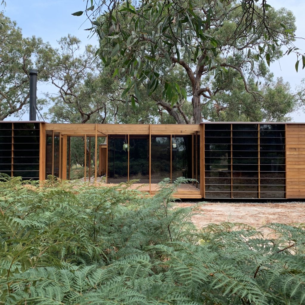 The structure rests lightly on the land, gently elevated to allow water to move as it always has, marking time through flood and drought. Trunks of blackened messmates still bear the memory of past fires, grounding the house in history.