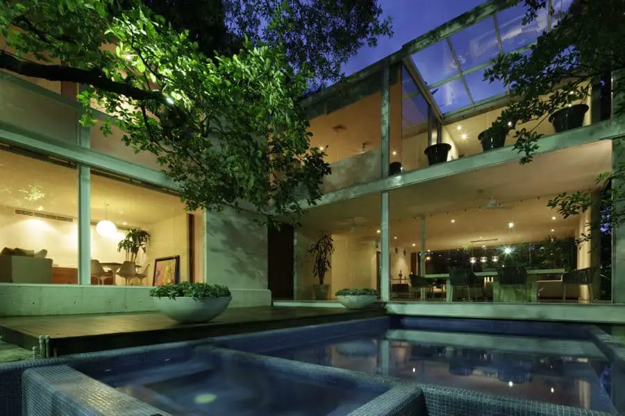 TAL Architects situated the kitchen on the northern wing of the property. It’s spacious and well equipped with the latest modern appliances for all living comforts. On the upper level, the remaining bedrooms and bathrooms are located. All the rooms have walk-in-closets. The glass roof continues throughout, giving the illusion of stretching above the skies and clouds, like the shrines of ancient Aztec cities. In Aztec cosmology, the four corners of the universe are marked by “the four Tlalocs”, which together hold up the sky and function as the frame for the passing of time.