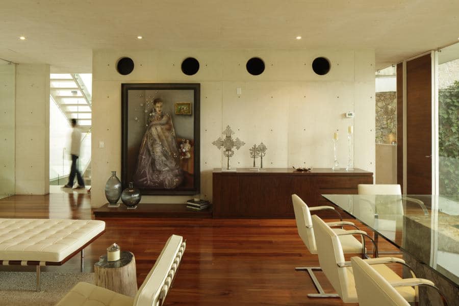 The team of TAL Architects ensured the homeowners sufficient privacy by closing off the western edge of the plot with a high concrete wall. This wall also protects the house of glare inducing sunset rays in the afternoon. The house and the fence wall, have structural steel I-beams, poured concrete walls and are all painted white for uniformity. It is a spectacular and modern tribute to the supreme god of the rains, Casa Tláloc.