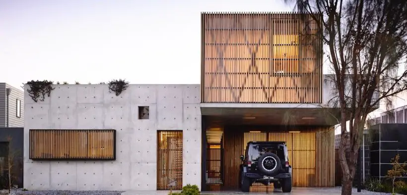 Concrete is in full force in this contemporary home design. Located in a suburban neighbourhood of Torquay, in the Australian state of Victoria, there’s a golf course nearby, and views of the nearby wetlands from several vantage points, including the garden on the roof.The façade is dominated by two rectangles of concrete, and a series of hardwood battened screens. These two elements balance really nicely, with about the same amount of room given over for each.
