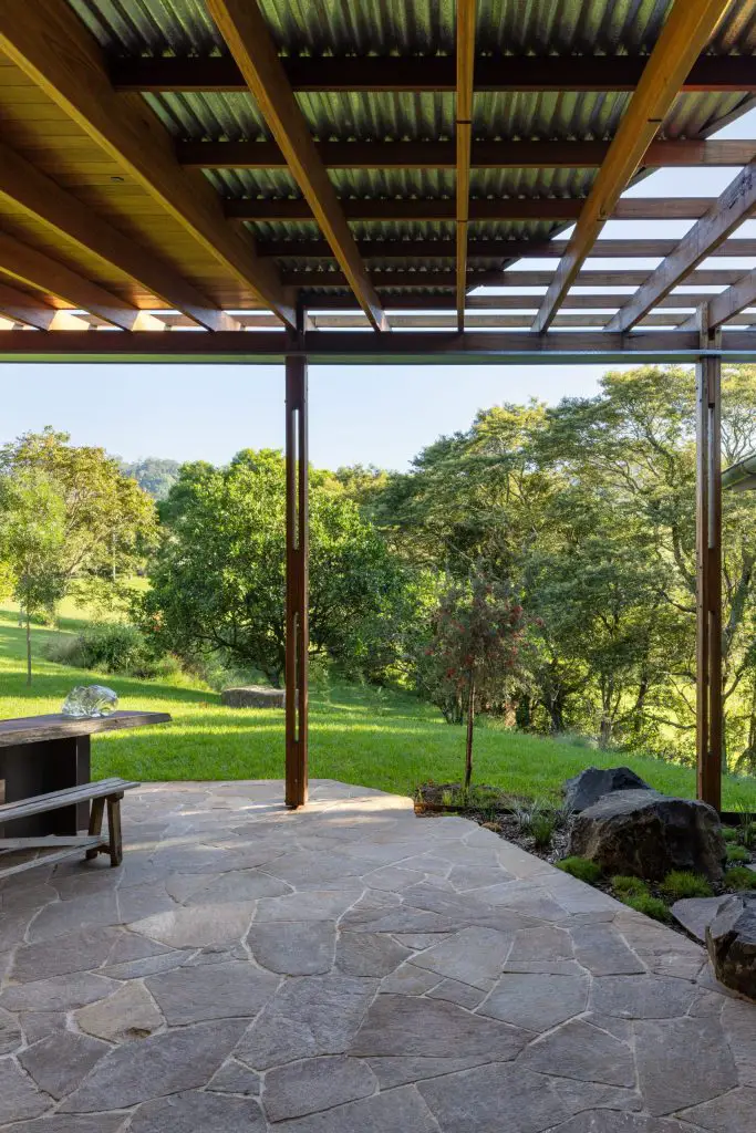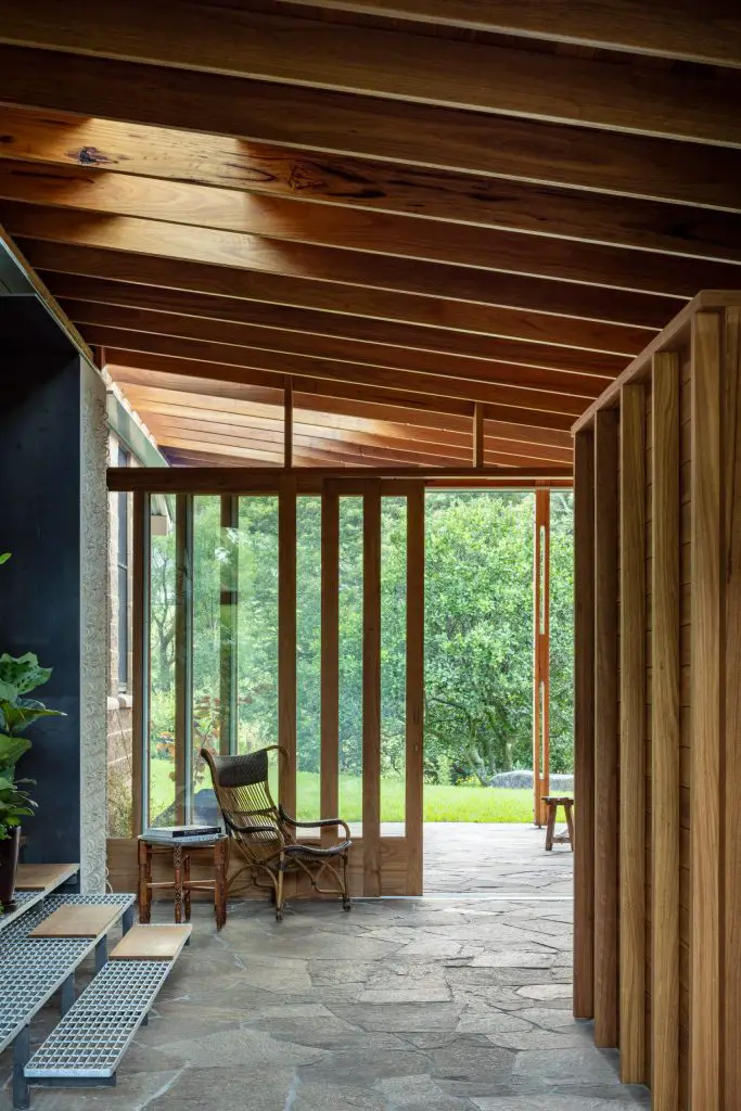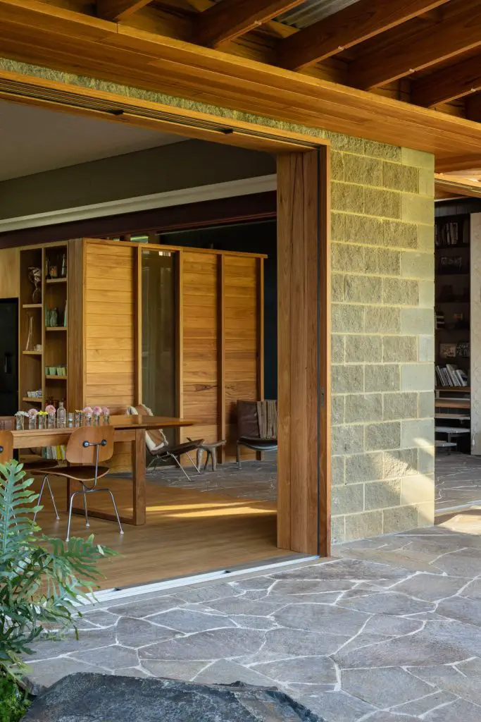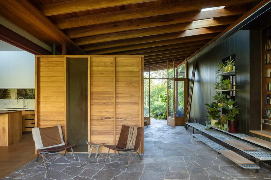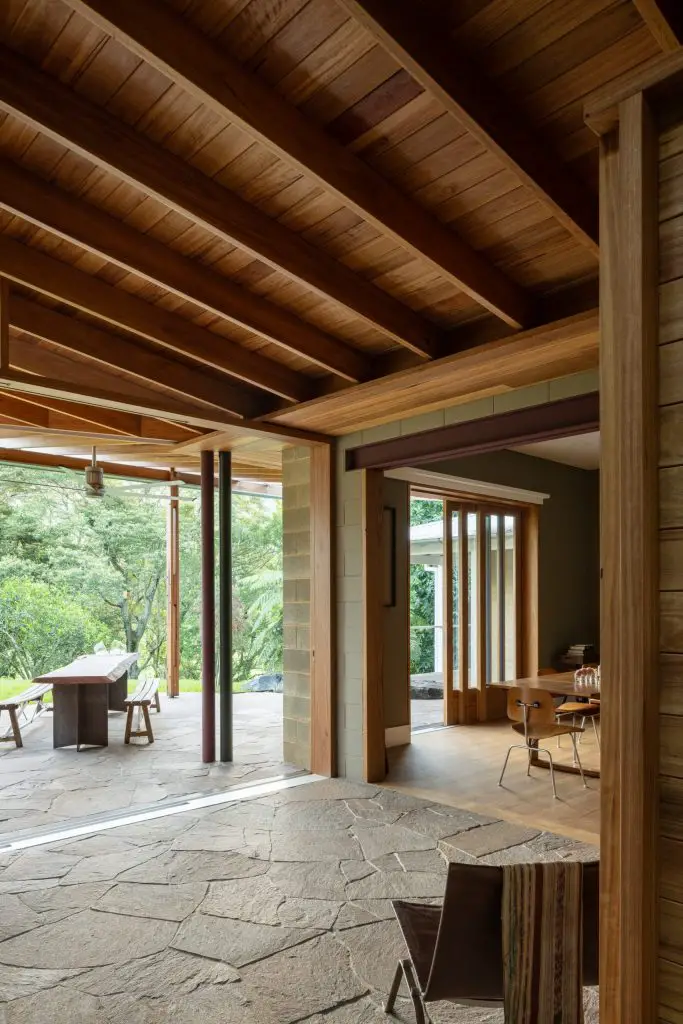 This shift feels subtle but decisive. The verandah becomes a shaded living room, open yet defined, where a Blackbutt-lined ceiling draws breezes through the interiors. Underfoot, granite paving runs from the garden into the house without interruption, softening any boundary between inside and out. Movement becomes fluid, almost instinctive, as the house opens itself to its surroundings.