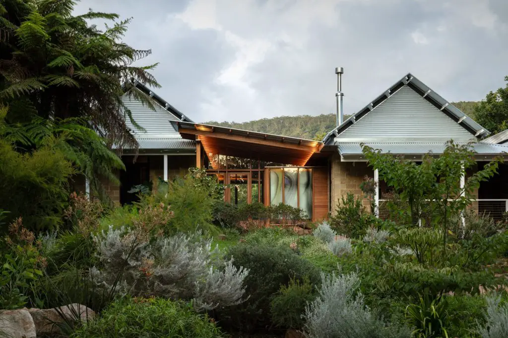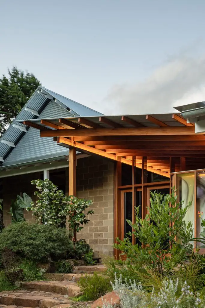 The architects focused on sustainability, which is embedded in the architecture itself. Deep eaves and carefully positioned openings manage sunlight across the seasons. Rainwater is collected, native planting supports the surrounding ecology, and a solar array allows the house to operate fully on electricity. Even the verandah roof has a role, balancing shade, winter sun, and long views towards the escarpment.