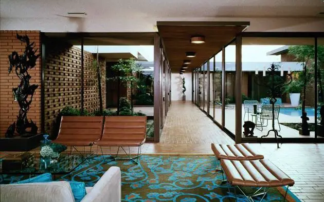 The use of heavy steel and brick is alleviated by over 4,000 square feet of clerestory glass windows that work to seamlessly integrate the interior areas of the house with its multiple courtyards and impart on Case Study House #28 the notions of classic mid-century modern architecture.