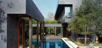 The area inside the square, occupying the space between the two parallel wings of the house and their perpendicular glass corridors, consists of an expansive courtyard which houses a swimming pool and garden area.