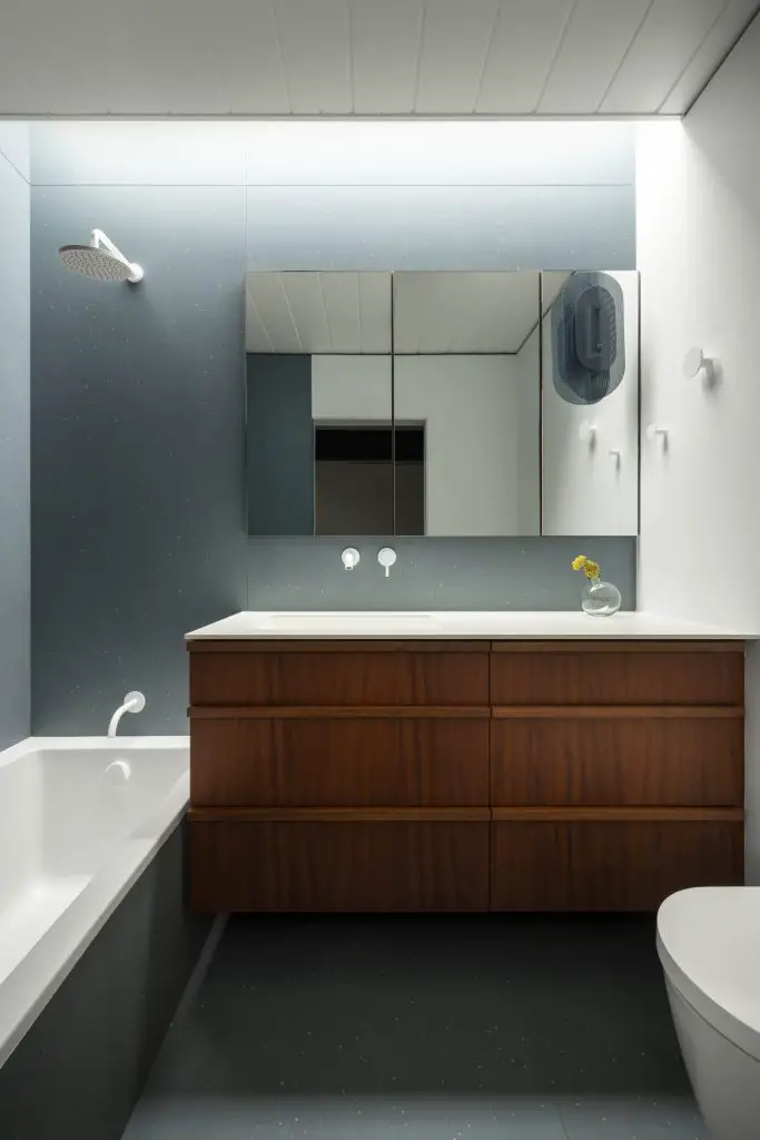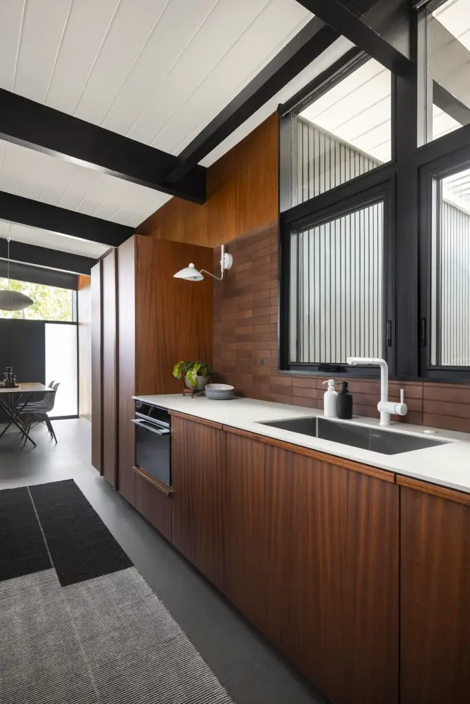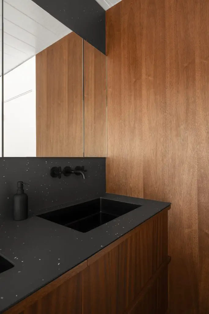 Custom cabinetry, designed by Marshall Interiors and crafted by Ermin Hodzic of Woodcraft Plus, continues the language of line and texture. Every piece, every joint, is considered. Marmoleum flooring underfoot nods to the original material palette while offering a practical, tactile update. Large-format porcelain tile brings in durability without disrupting tone, its matte finish and scale quietly referencing vintage laminates.
