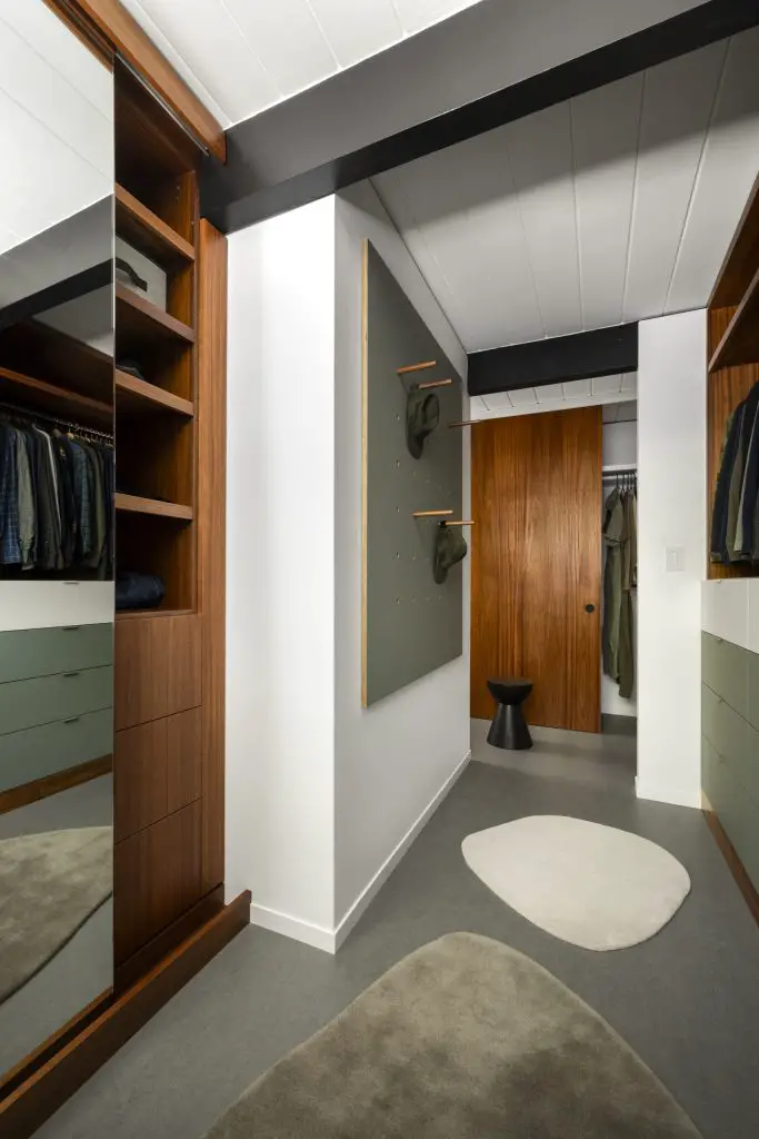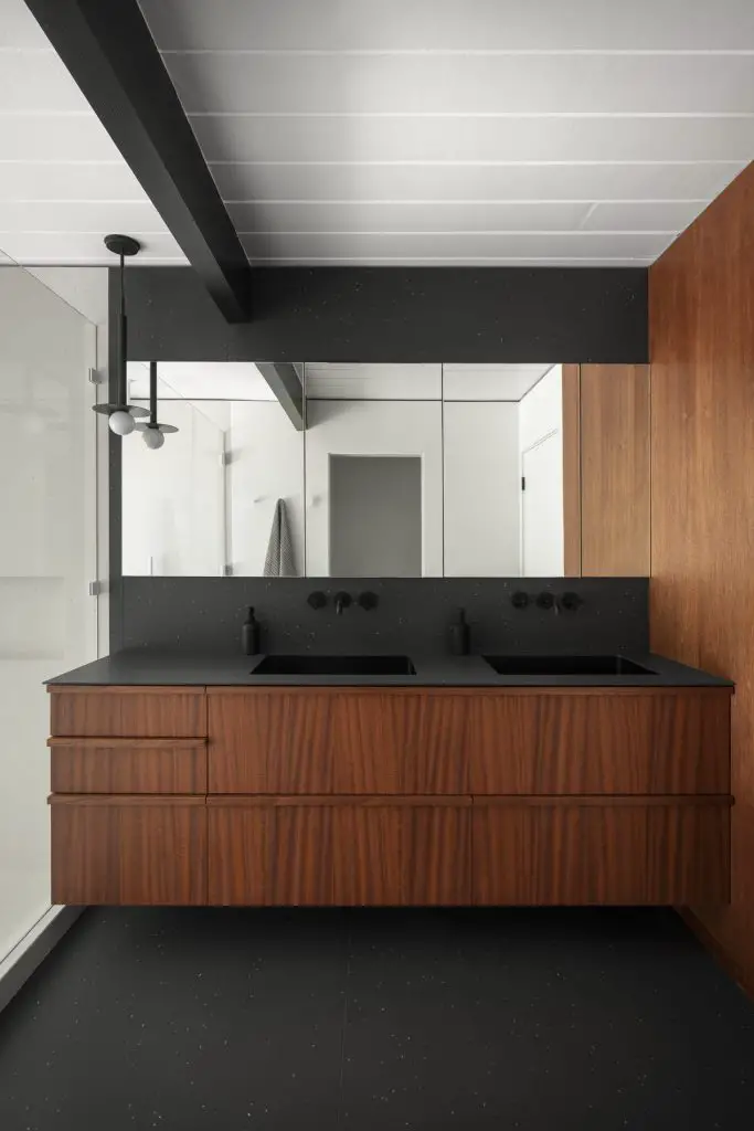 The home’s original architectural language remains intact, now spoken with new fluency. Mahogany paneling wraps the interiors with a familiar warmth, anchoring the living spaces in wood and grain. Perforated sliding doors move in quiet dialogue with the home’s structure, restoring both privacy and flow. Nothing is added without intention; everything connects.