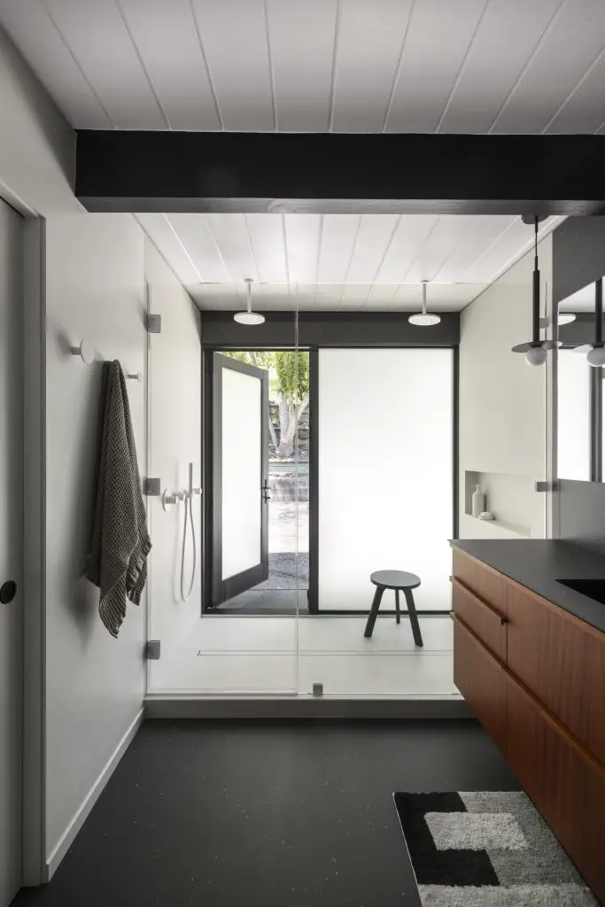 In collaboration with Blaine Architects, the footprint expanded to meet the needs of a modern family—two new bathrooms, a bedroom, an office, and a reimagined primary suite that borrows gently from adjacent space. The suite now unfolds with dual walk-in closets and a double shower that opens directly to the outdoors, a detail that feels both generous and inevitable.