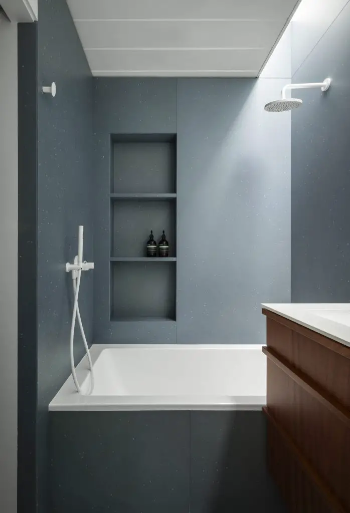 Each bathroom speaks its own color story, with Mutina’s Primavera tile offering a playful contrast of tone and texture. Saturated hues meet soft light from newly placed skylights, turning these functional spaces into moments of pause. It’s a material narrative—one that feels curated, not designed.