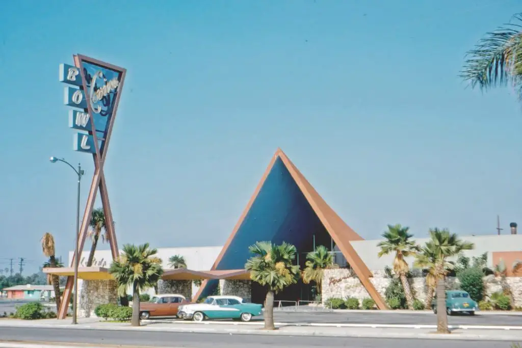Mid-century modernism also made its mark on leisure spaces, none more distinctively than Los Angeles’ bowling alleys. These venues fused social gathering with architectural flair, featuring bold signage, streamlined forms, and interior details that captured the exuberance of the era. Structures like the Hollywood Star Lanes or Covina Bowl were more than recreation centers, they were immersive modernist environments.Â