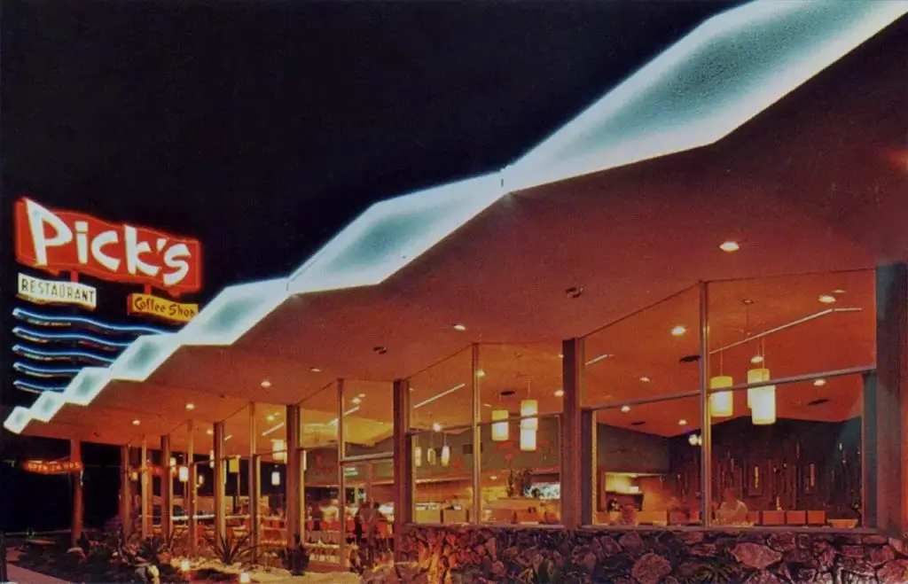 With upswept roofs, neon signage, and exuberant shapes, these buildings turned everyday roadside stops into space-age landmarks. Places like Johnie’s Coffee Shop and Pann’s remain vivid reminders of a time when architecture reached out to the street, inviting passersby into a vision of the future, one milkshake or slice of pie at a time.
