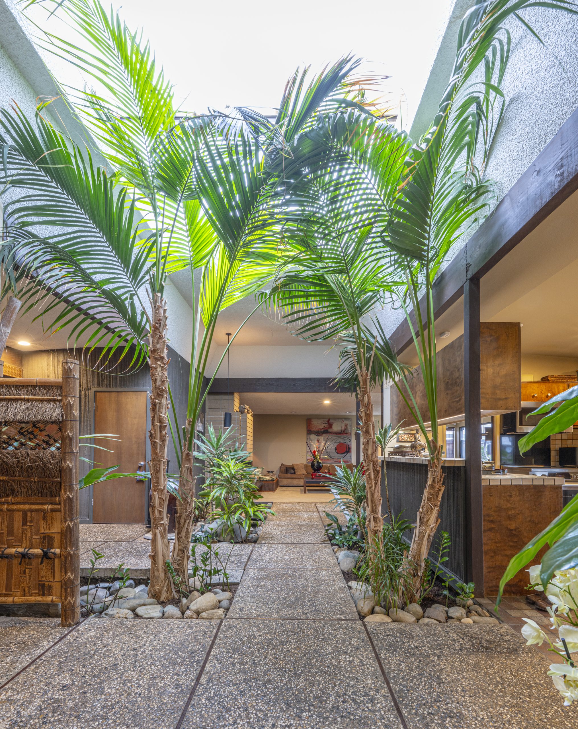 The designer’s signature gesture was the dry creek. In this house, it begins at the enclosed entry, runs alongside the exposed aggregate walkways of the atrium, continues into the backyard, and disappears behind a berm. “You always feel the creek keeps going, out into the landscape beyond,” Dark says. Fernandez would even hide a small bubbling fountain out of sight so “you’d swear the creek actually had water.”