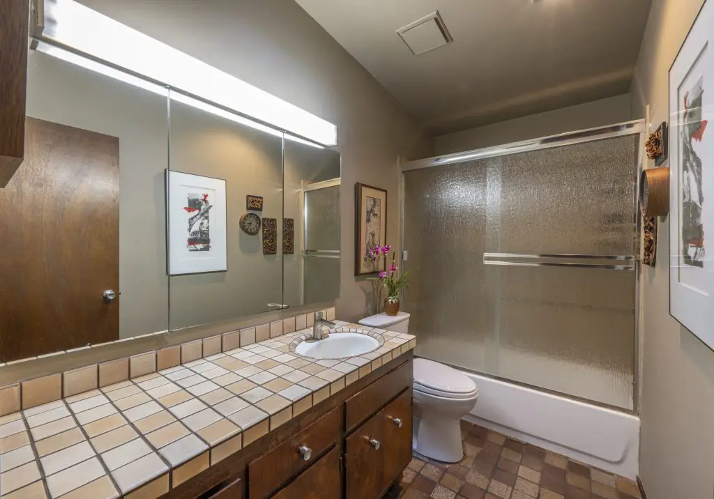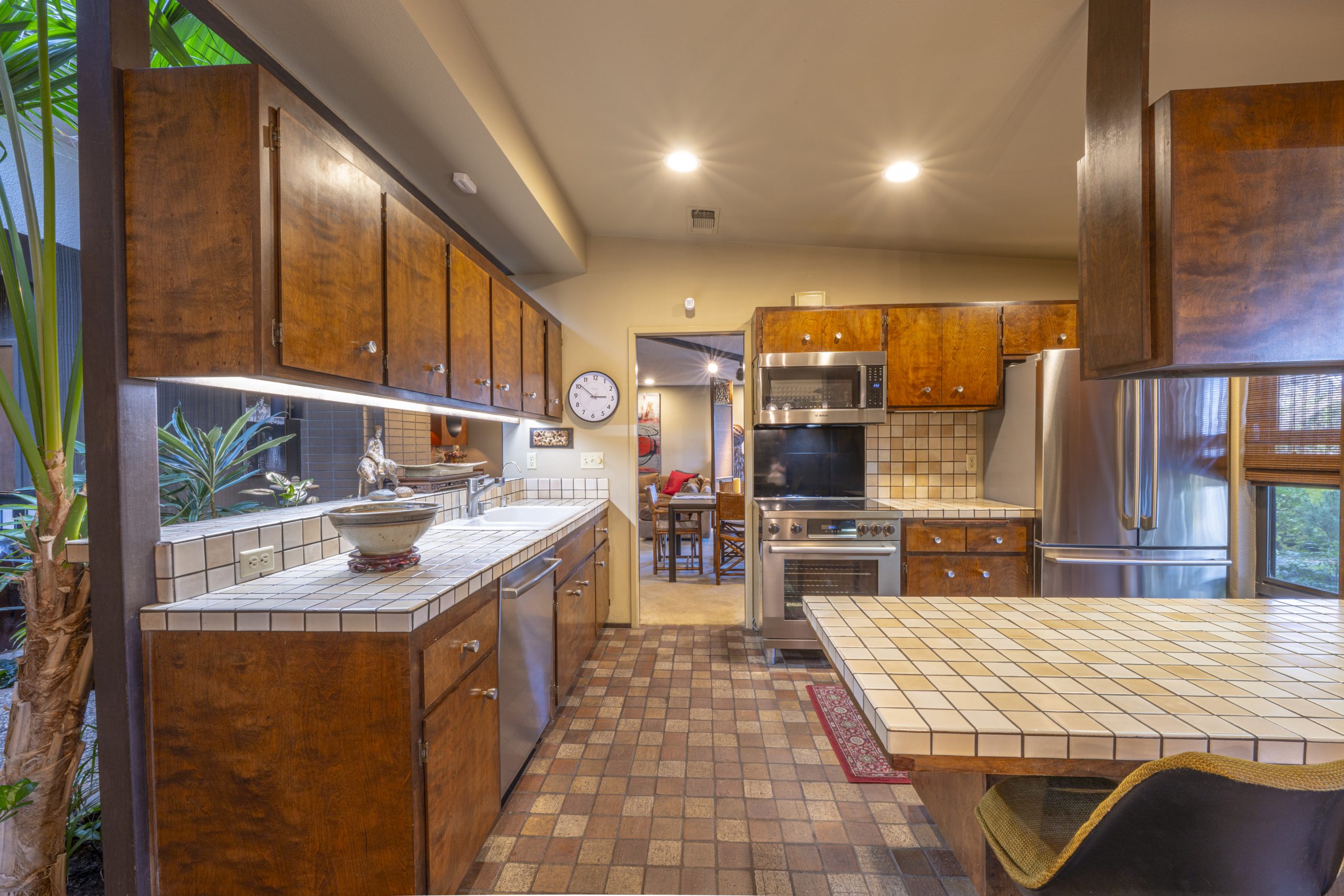 Material discipline ties everything together. Warm walnut slab cabinetry continues through kitchen and baths. Beige tile repeats across counters. Exposed redwood beams in their original Mission Brown stain provide structure and warmth. “It all works together as a single composition, and that’s entirely Larry’s discipline,” Dark says.
