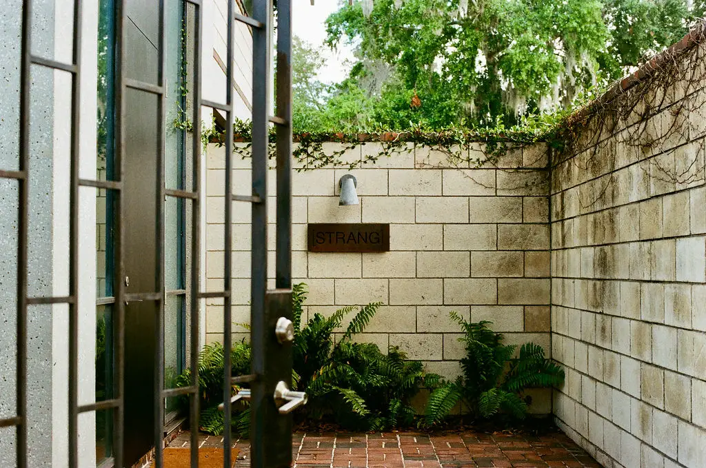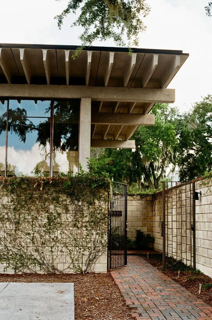 When you step into this house built in 1956, the Winter Haven, the language of the architect becomes vivid and tangible. The unadorned concrete‑block exterior embraces the site. A flat roof hovers low, bringing you closer to the surrounding oaks and landscape. Glass walls open onto a central courtyard and allow daylight to cascade across the interior, dissolving boundaries between inside and outside.
