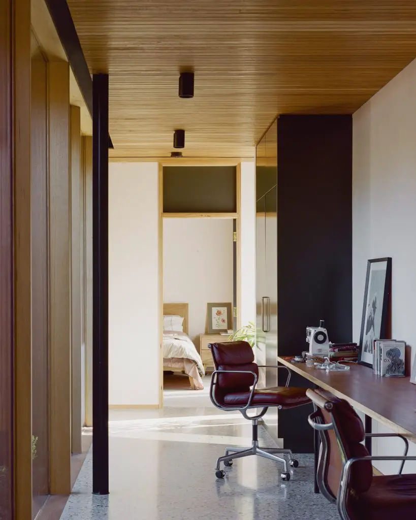 The public‑facing areas, kitchen, dining, and living – feature floor‑to‑ceiling BINQ windows that pull in the views and flood the space with light. The kitchen is all about connection, with two freestanding islands that invite people to gather, whether you’re cooking or not. From there, sliding doors lead to a more tucked-away lounge, and then into a small office and four bedrooms, all positioned on the private side of the house, looking inward onto the courtyard.