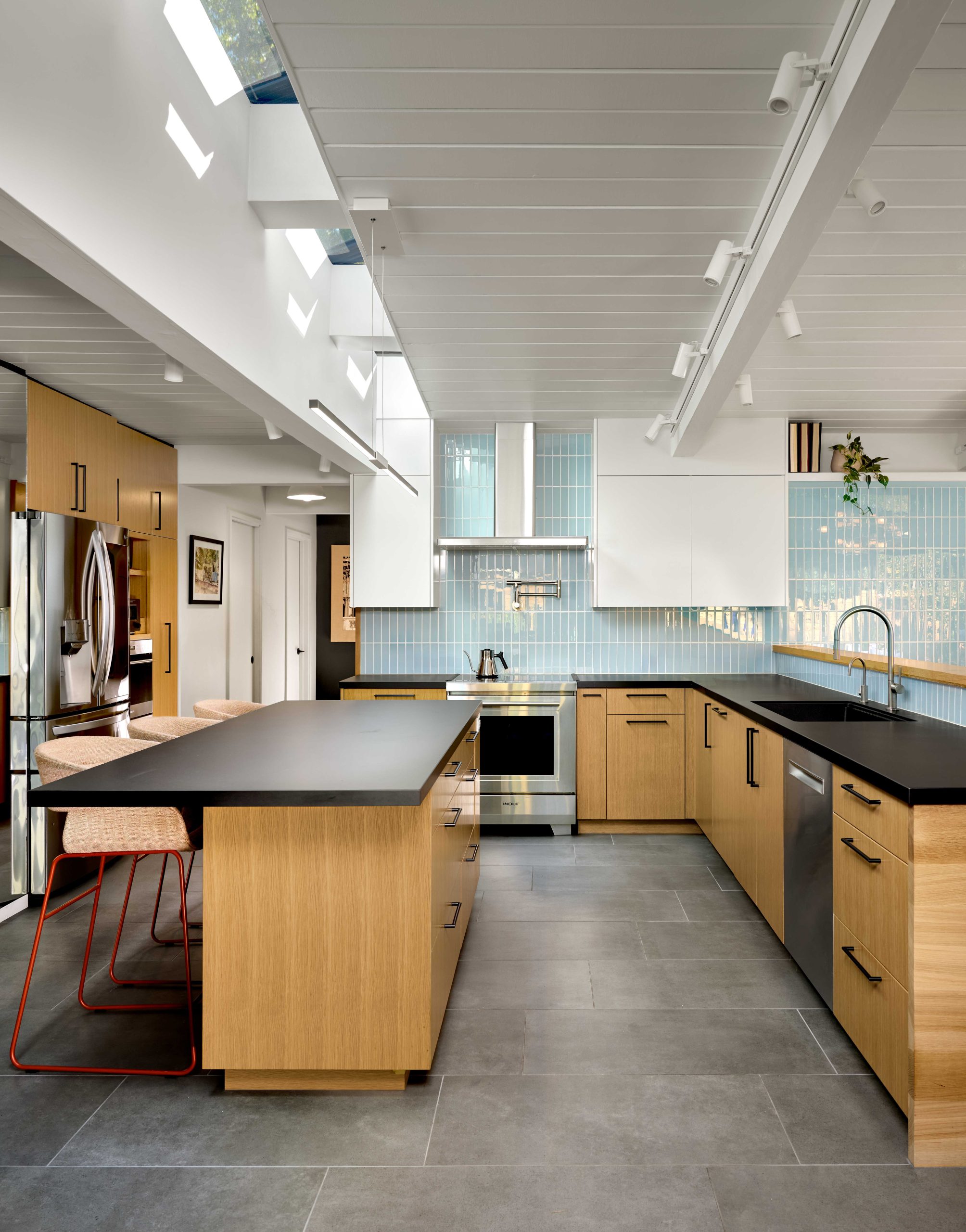 Material choices reinforce this sense of continuity. Oak cabinetry, large gray floor tiles, and bronze window frames create a calm backdrop that allows moments of color to appear throughout the house as subtle accents.