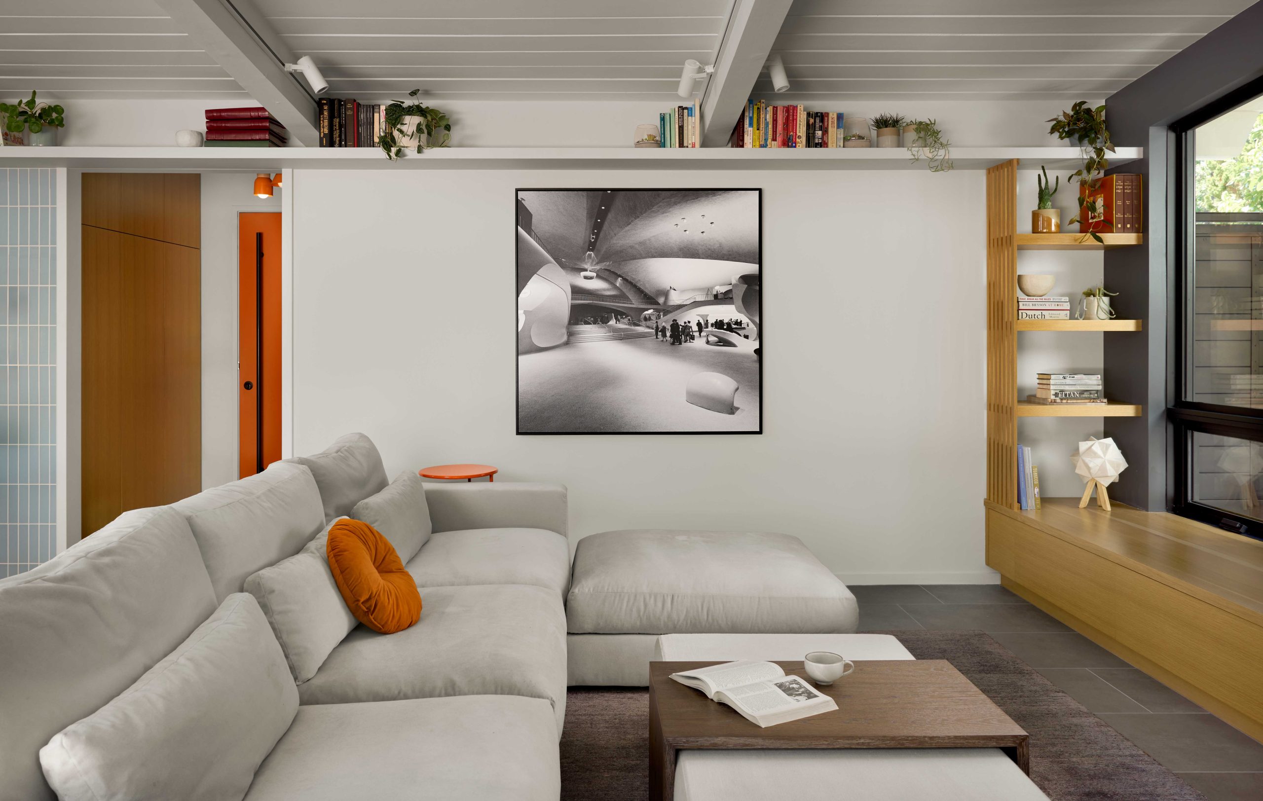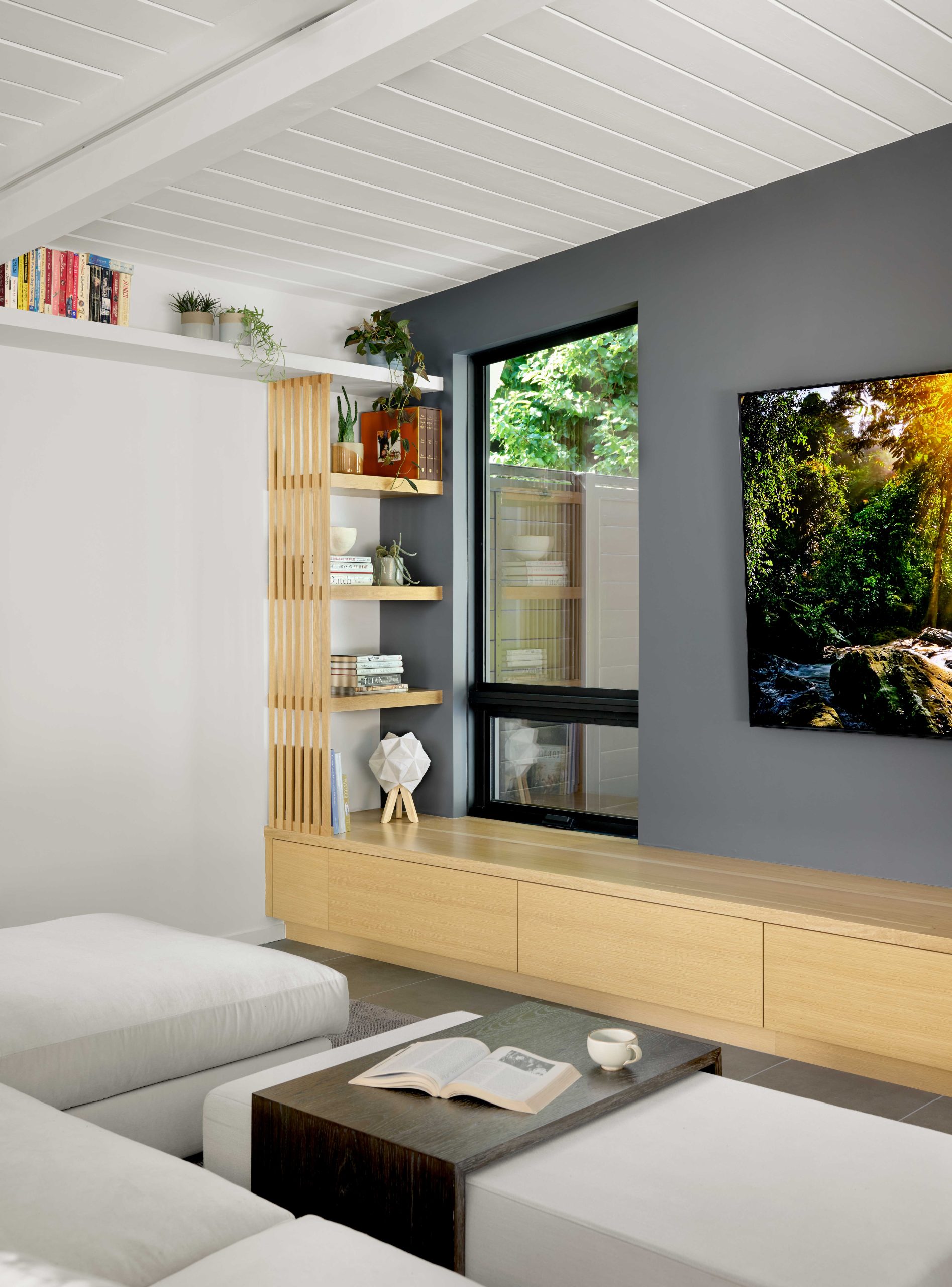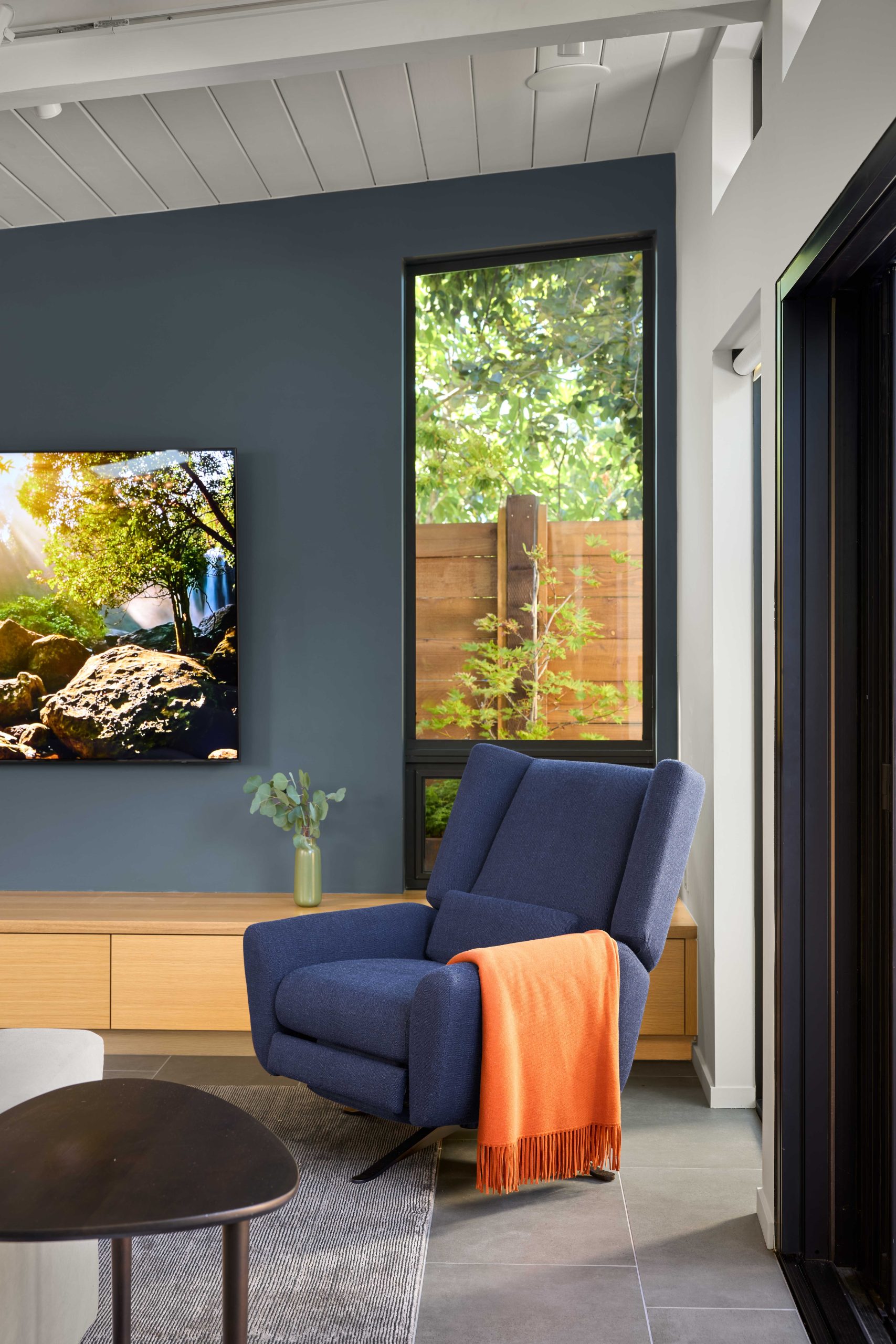 Crucially, the architects restored key original features. The tongue‑and‑groove ceilings and exposed beams, elements that define the warmth of many Eichler interiors, were carefully revealed and repaired. These details now run continuously through the living areas, grounding the renovation in the home’s mid‑century roots.