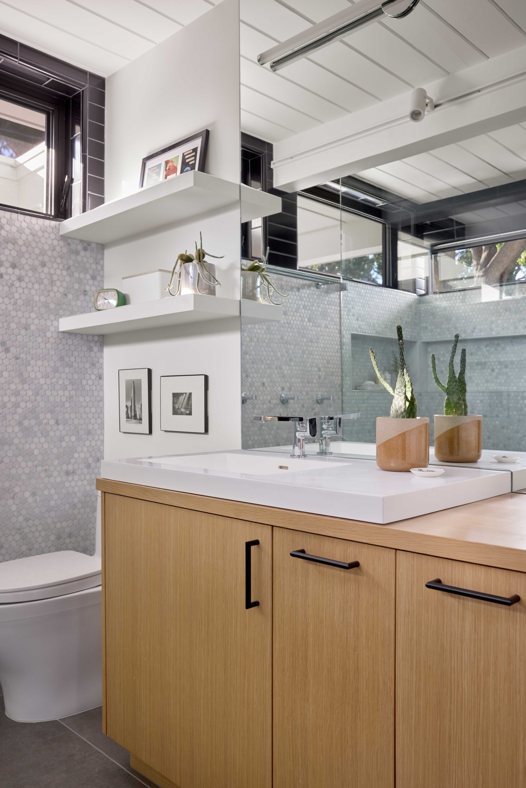 The renovation also introduced a modest addition. An extra bedroom allows each of the three daughters to have her own space, while the parents’ suite was expanded to include a walk‑in closet and dedicated bathroom. The new spaces integrate seamlessly into the house, maintaining the low horizontal profile typical of Eichler architecture.