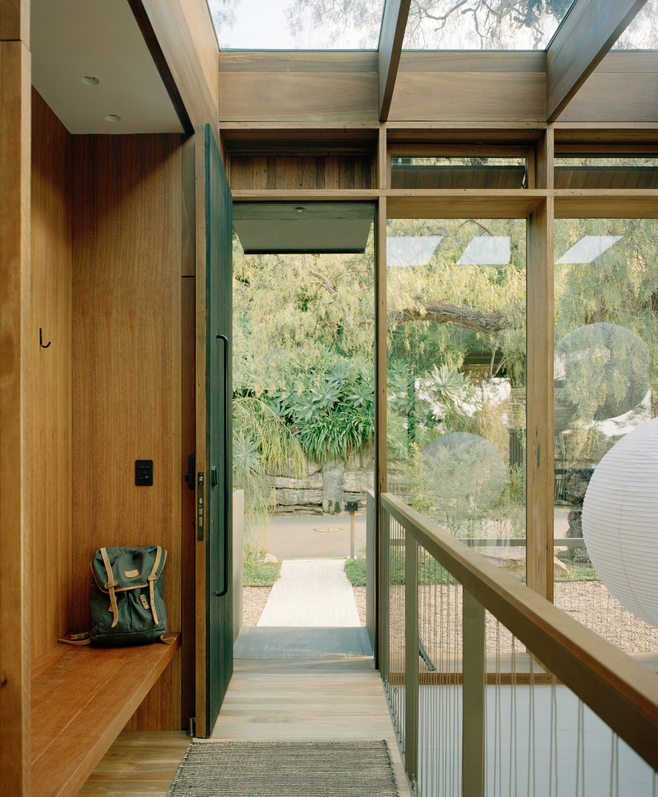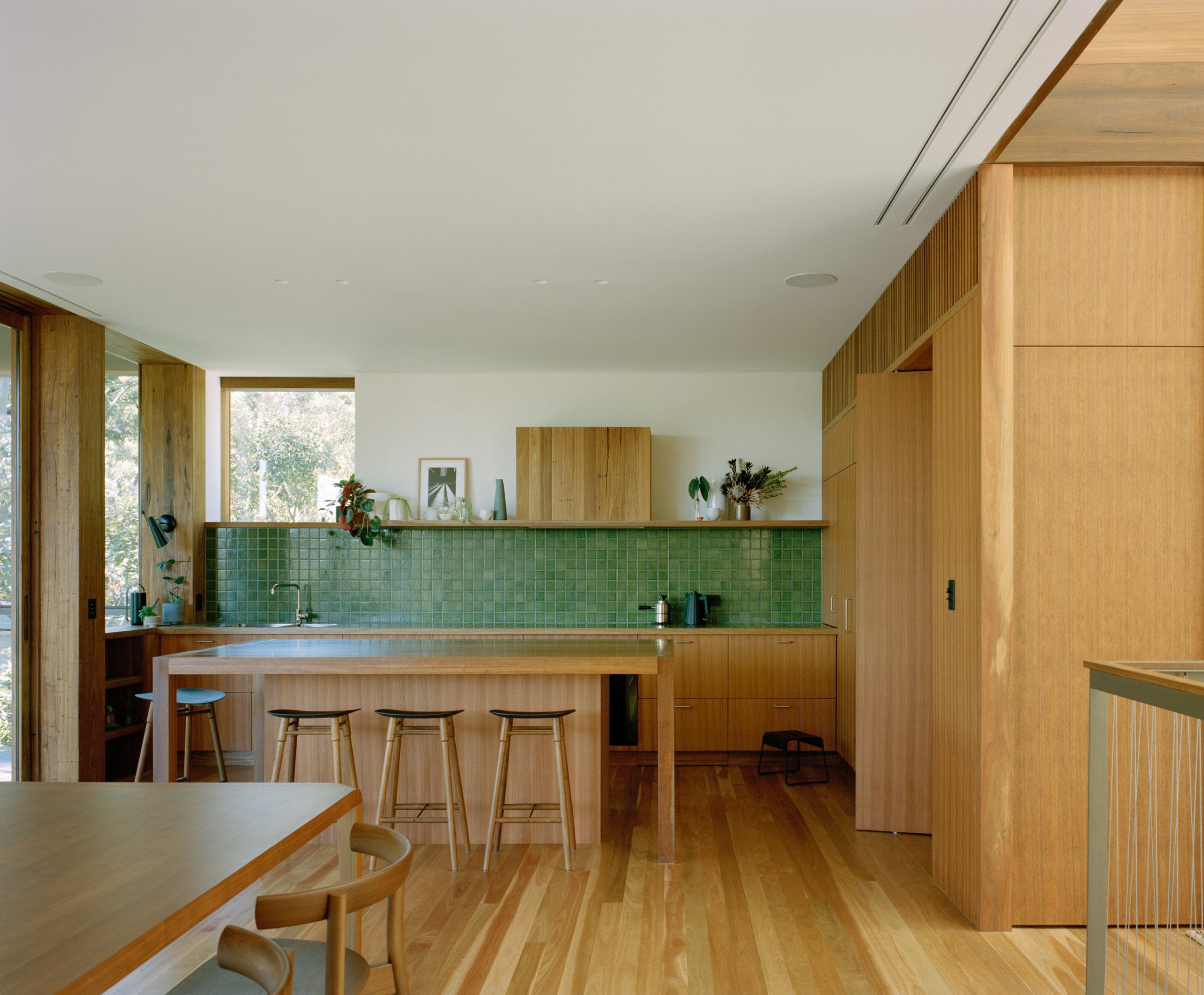 Salvaged elements, including sandstone boulders, old rafters, and a hand-painted splashback, have been reintroduced with care. Throughout, textures and details quietly reference the home’s mid-century origins.