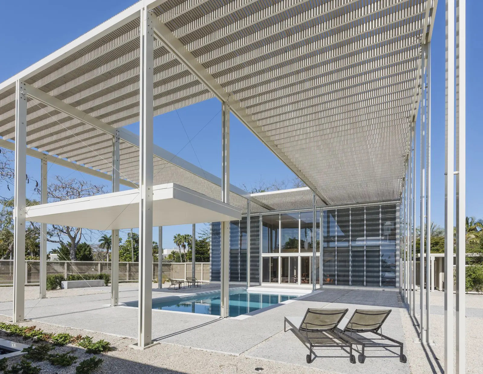 Passive strategies such as cross ventilation, shading, thermal mass, upgraded insulation, and double glazing support year-round comfort. Rainwater is collected for reuse, and the home runs entirely on electricity, supported by a substantial solar array.