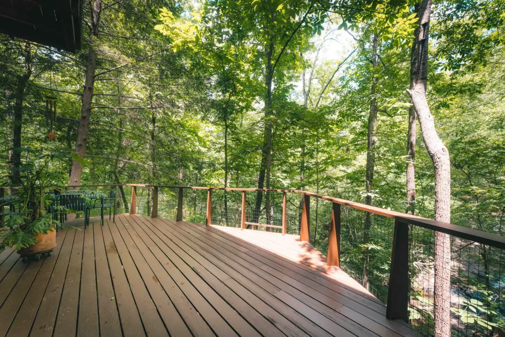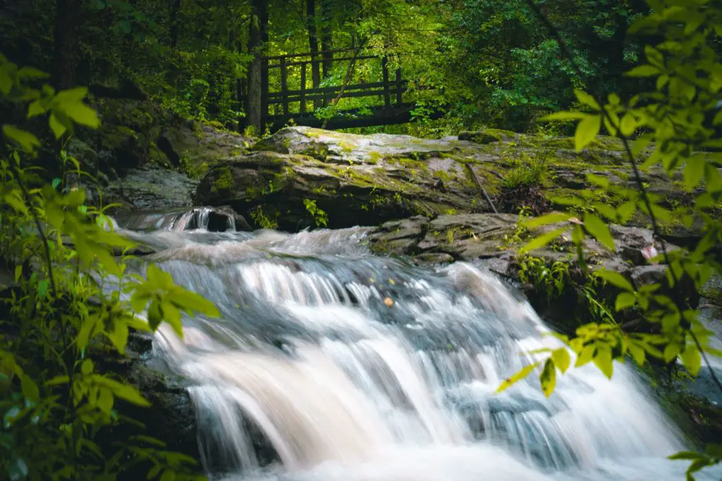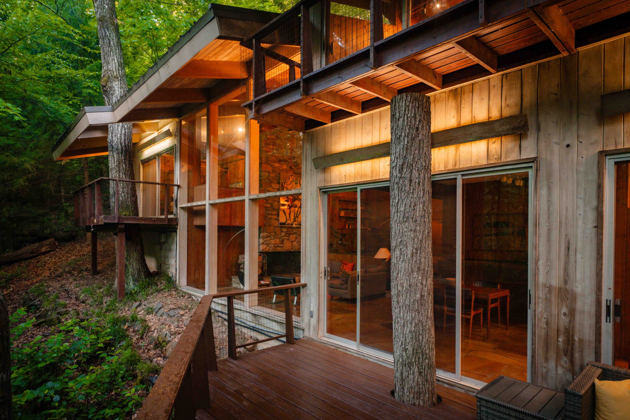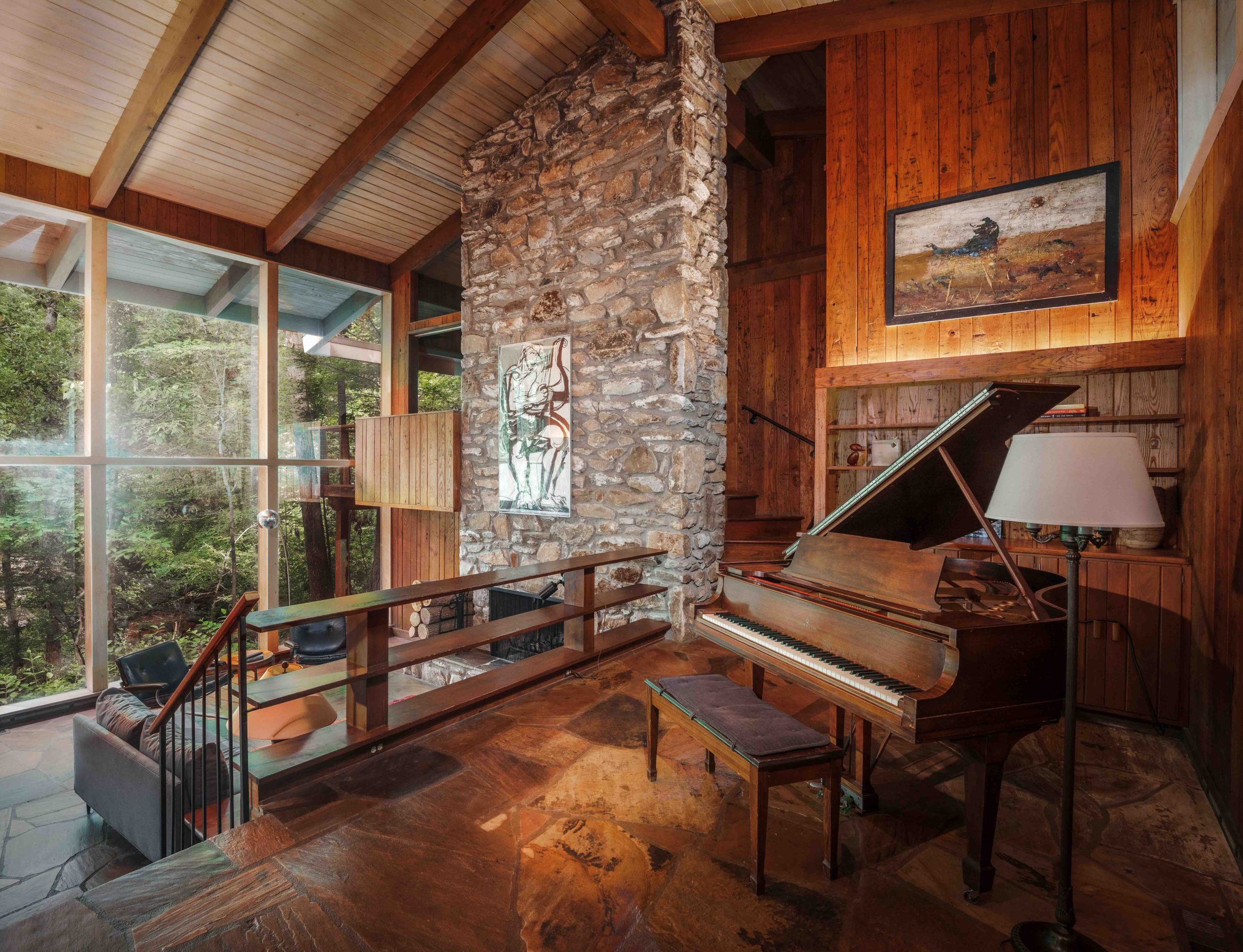 The house spans just over three acres between Emory Village and Druid Hills – close to the city but buffered by forest. Nearly every room faces the waterfall, which carries Peavine Creek beneath one corner of the structure. The creek stretches approximately 500 feet across the property, ending in a dual cascade that splits around a small island.