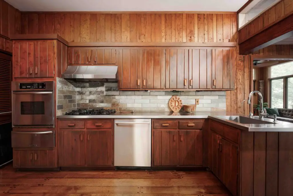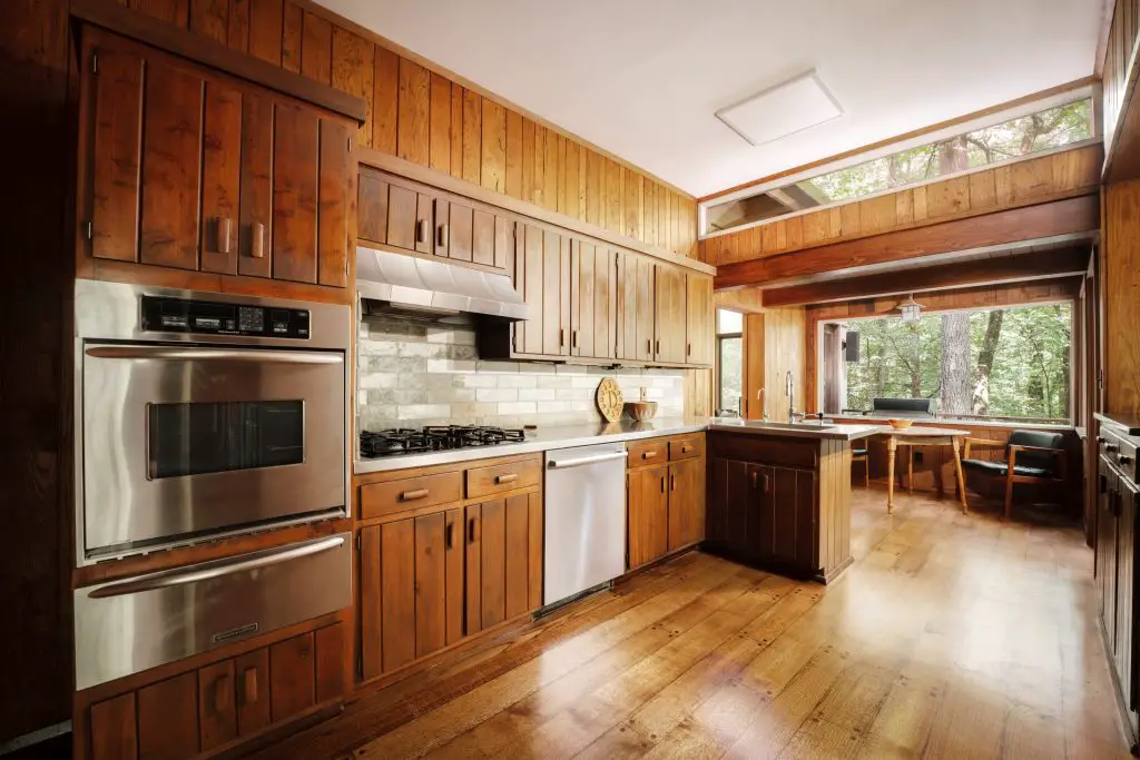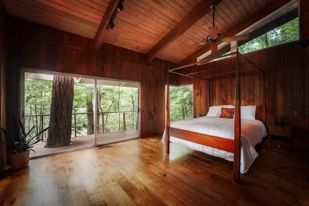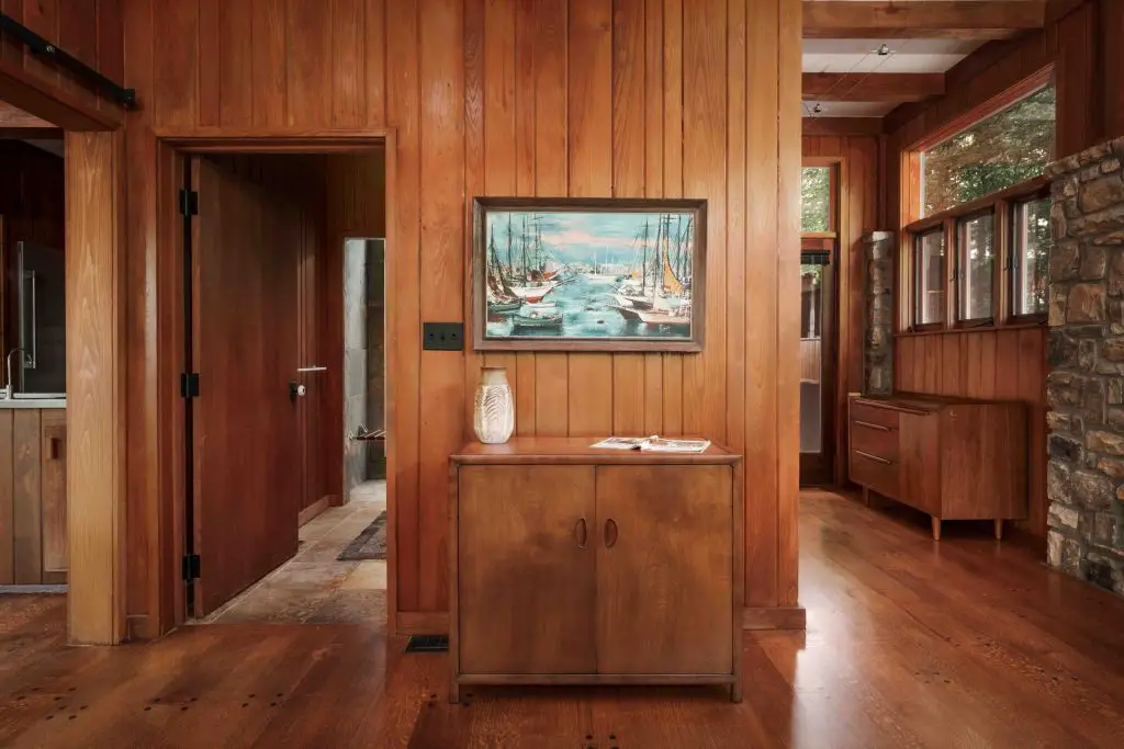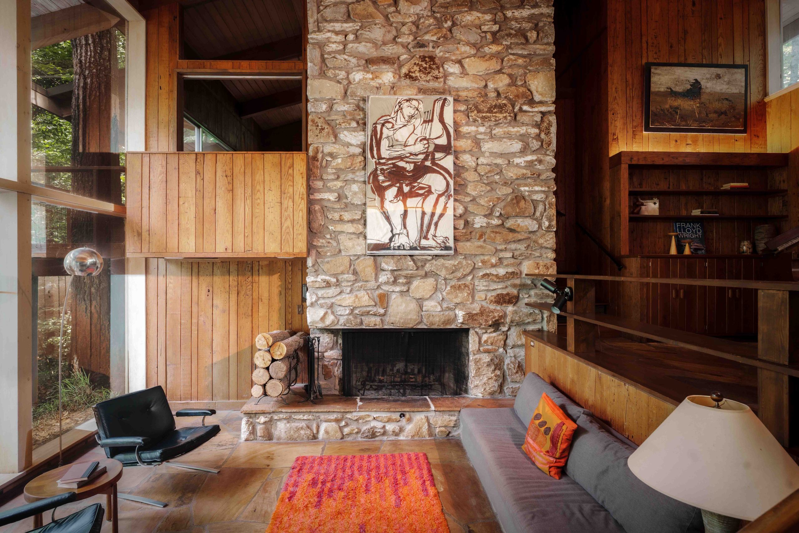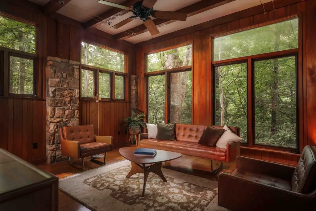 Materials drive the design. Wormy chestnut paneling – milled from a single tree – covers the interior walls. Stone defines the floors, fireplaces, and exterior transitions. Glass runs wall-to-wall, framing the surrounding woods and the falls. Every bedroom opens to its own balcony.