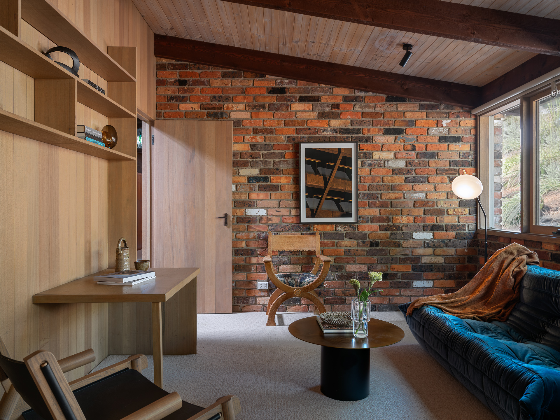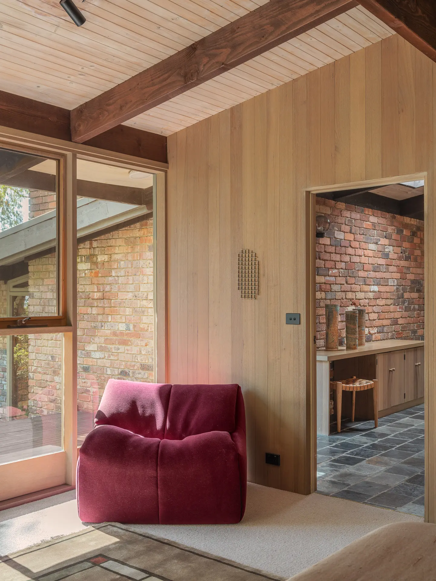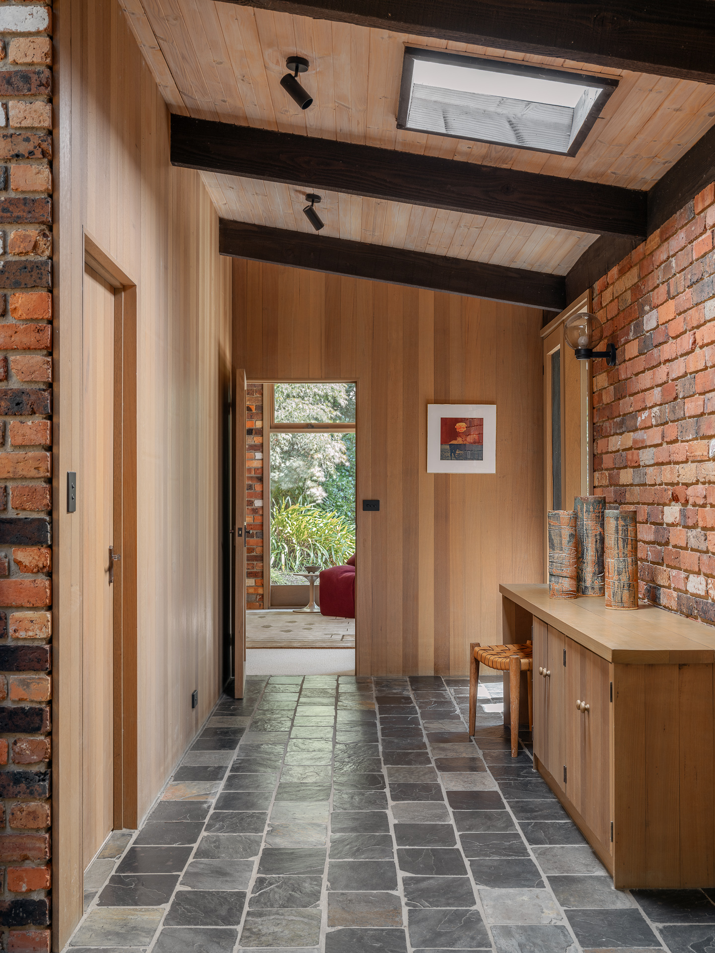 Material choices define the character of the home. Handmade red brick walls give the structure weight and texture. Oregon timber adds warmth to ceilings and joinery. Recycled materials appear throughout, reflecting Knox’s early commitment to sustainability. Nothing feels decorative for its own sake. Every surface has purpose and presence.