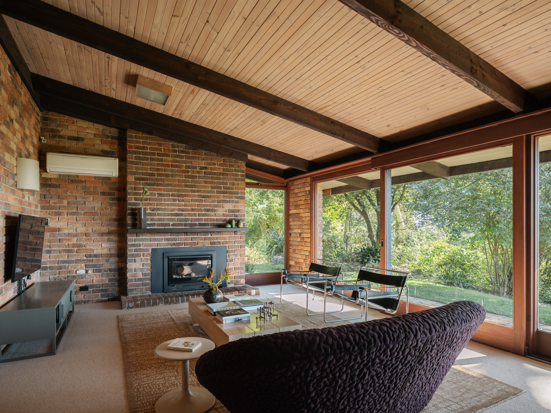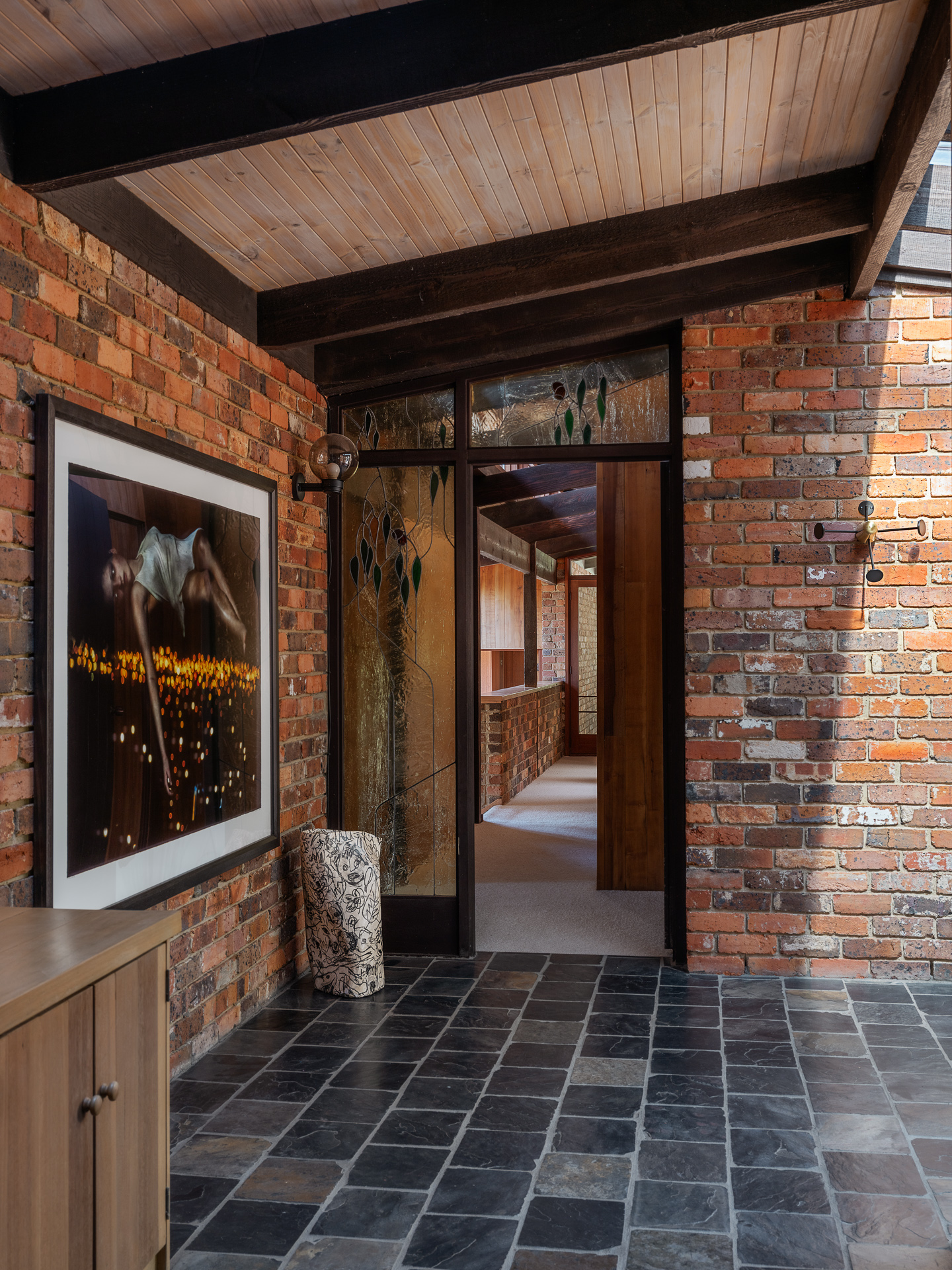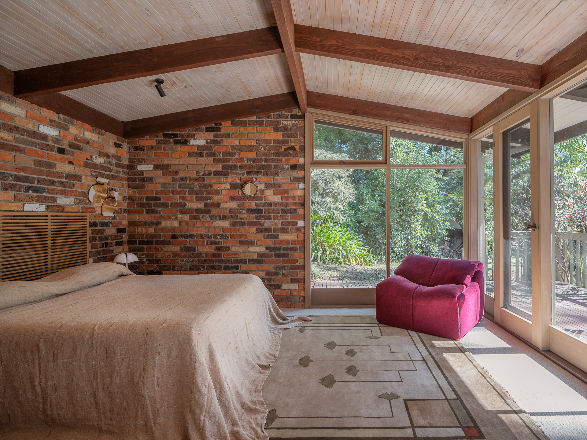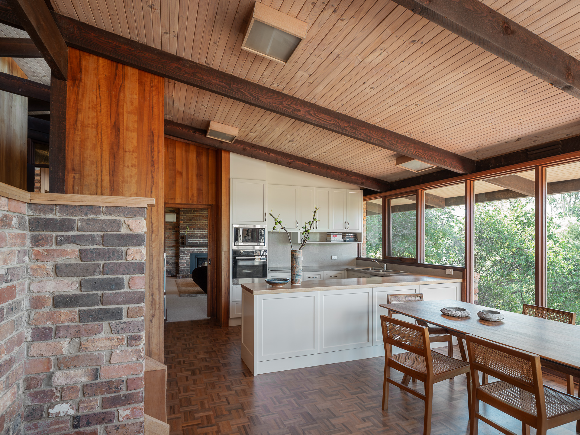 Material choices define the character of the home. Handmade red brick walls give the structure weight and texture. Oregon timber adds warmth to ceilings and joinery. Recycled materials appear throughout, reflecting Knox’s early commitment to sustainability. Nothing feels decorative for its own sake. Every surface has purpose and presence.