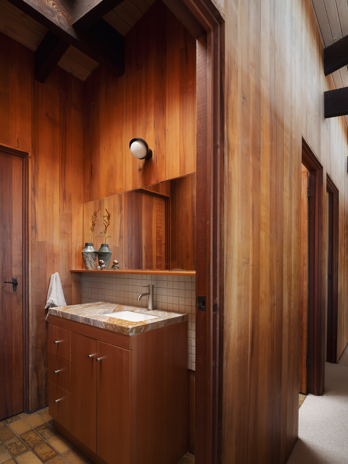 The current owners have updated the house with care. In the main living space, a new Australian made fireplace now anchors the room, strengthening its role as a gathering space. Premium wool carpets have been added for comfort. Parchment sconces introduce soft light, while natural stone vanities sit comfortably alongside the original bathroom tiles.