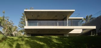 Large overhangs shelter deep-set niches which are wrapped in cedar and feature floor-to-ceiling glazing.