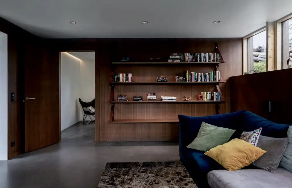 The home’s dark wood exterior is lightened up by double height windows which, in addition to inviting plenty of natural light to flood in throughout daytime, look over the stunning lush landscape.