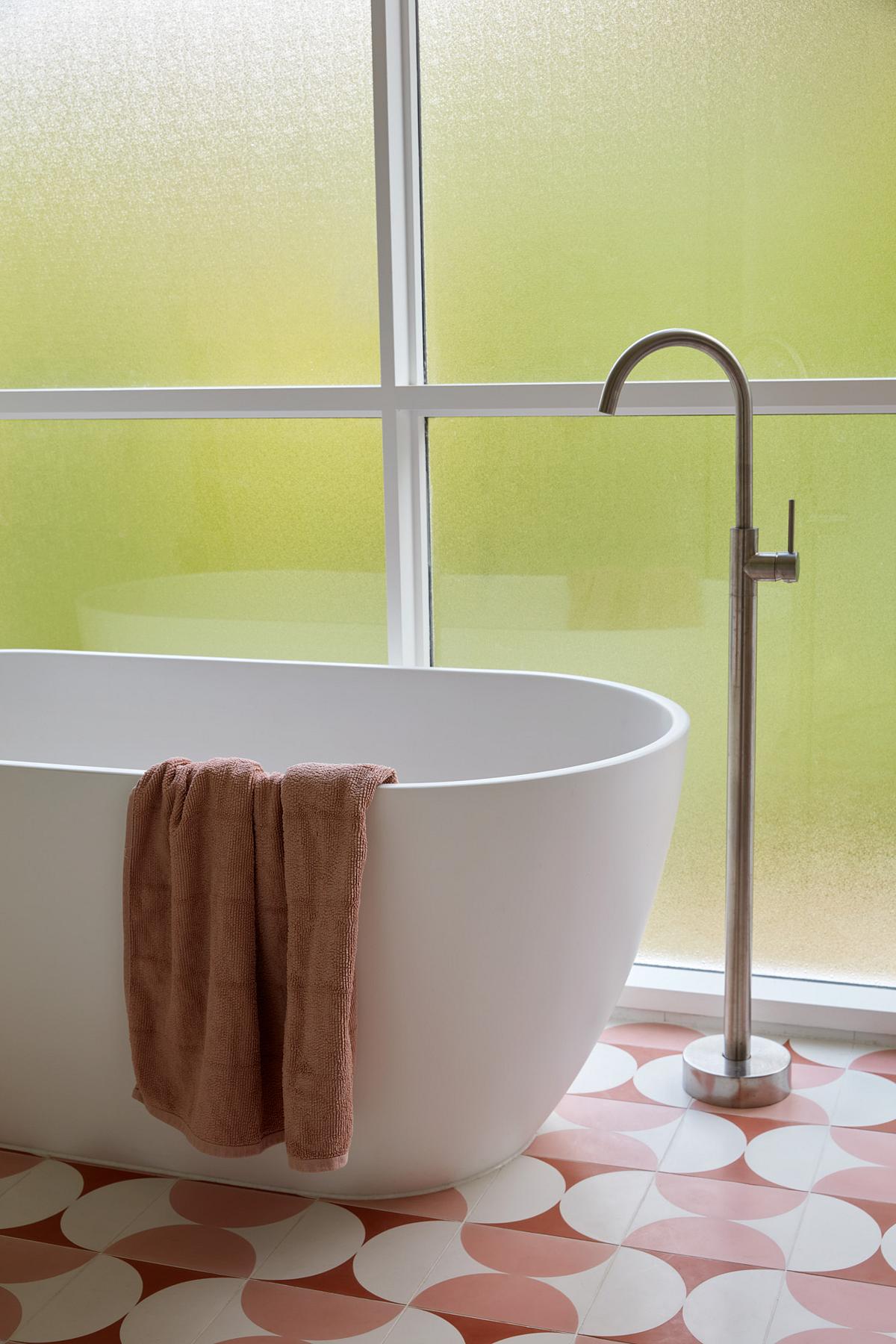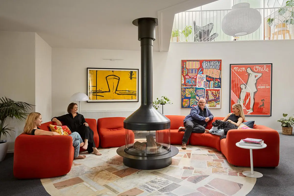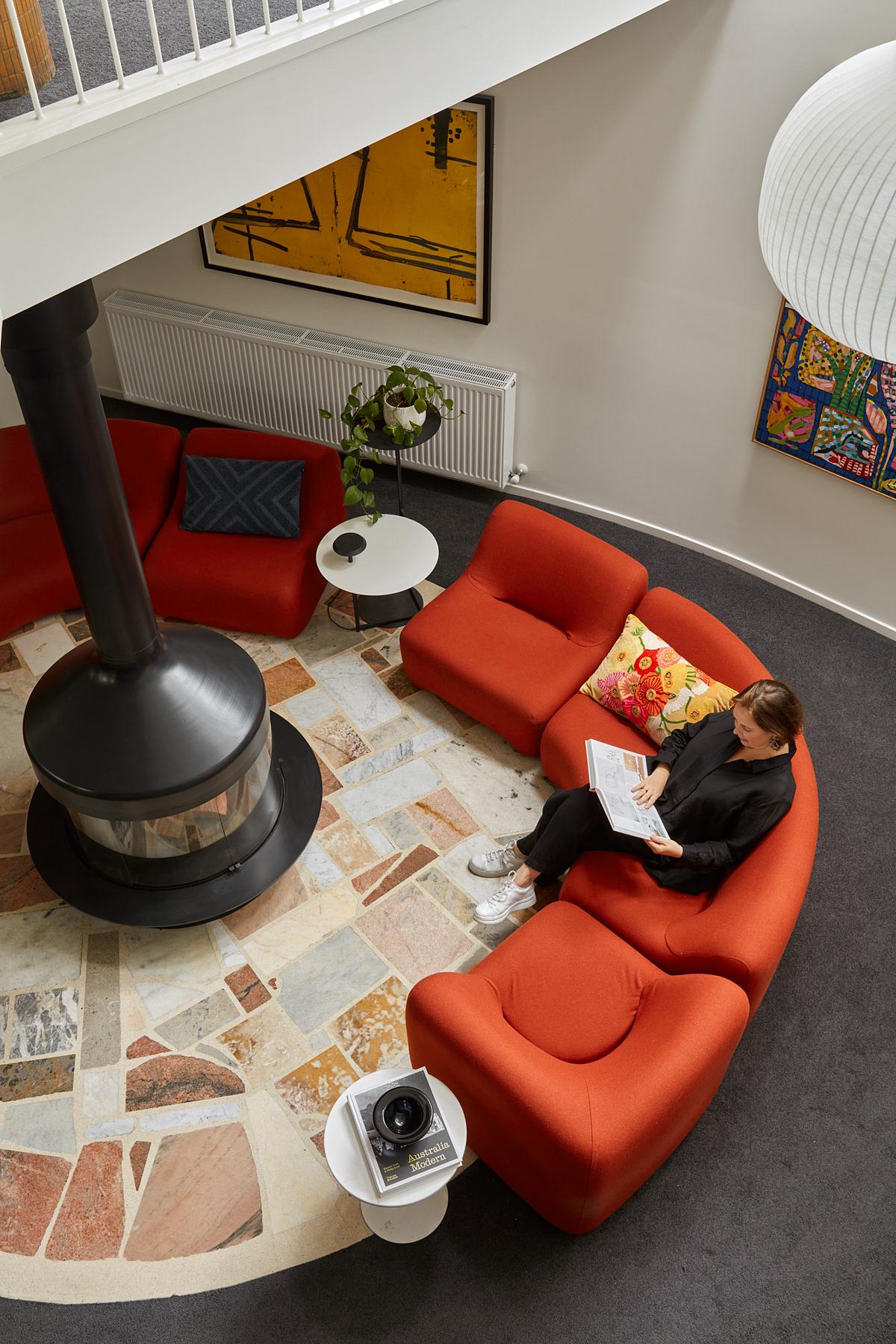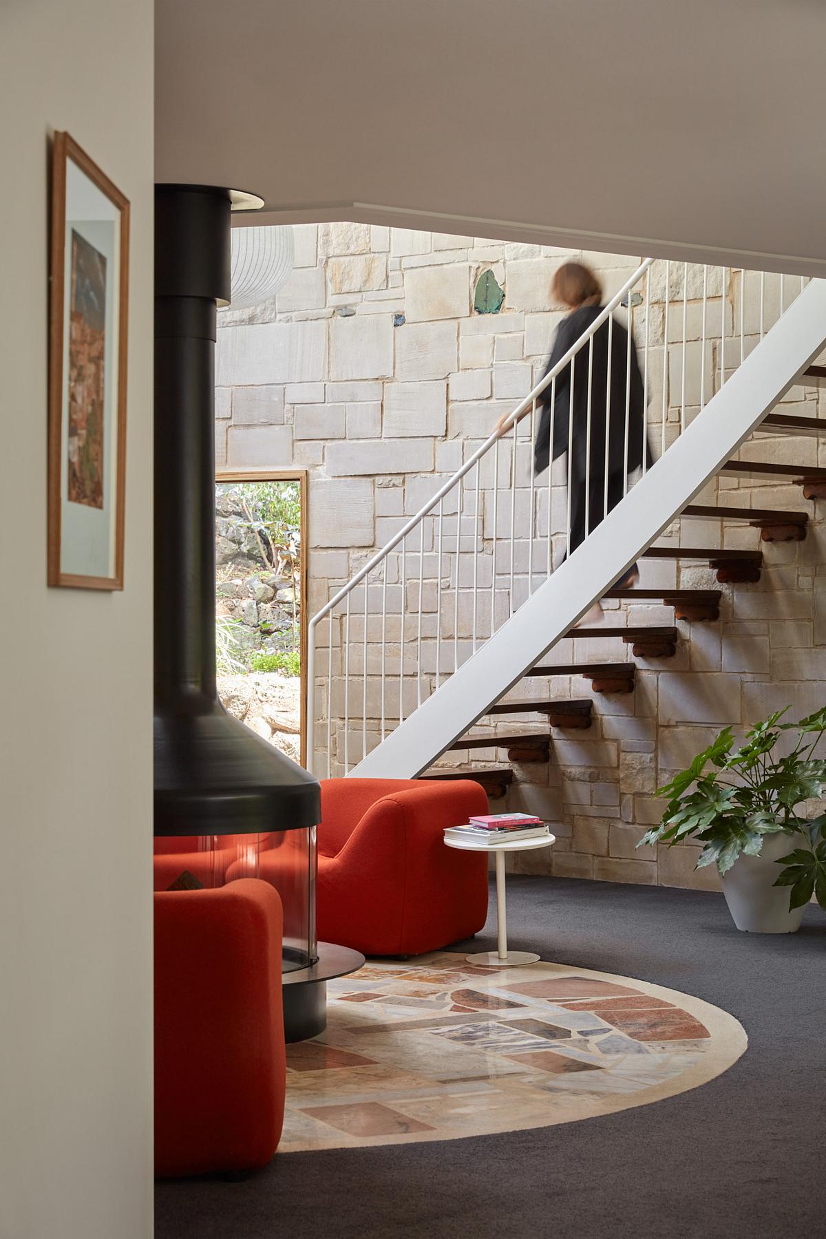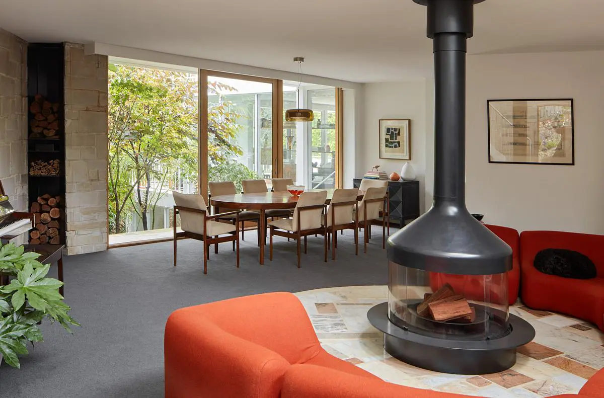 One of the most memorable moments of the renovation came from beneath the floor coverings. Hidden under decades of carpet and vinyl was the home’s original crazy pave tiling. The irregular stone surface, full of character and texture, pointed to the room’s earlier life as a sitting room. The design team restored this function, creating a warm gathering space organised around a sculptural “in-the-round” fireplace imported from overseas. The fireplace sits at the centre of the room, encouraging conversation and anchoring the space with quiet drama.