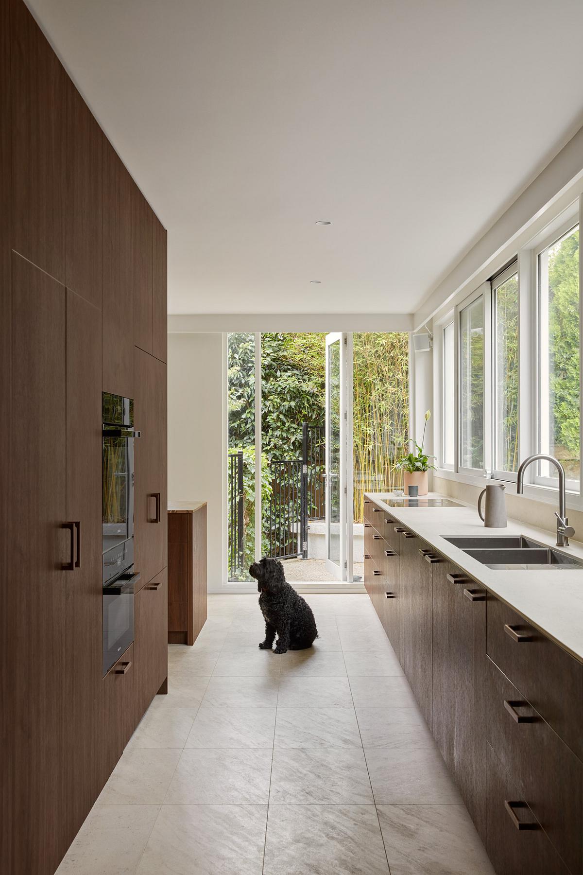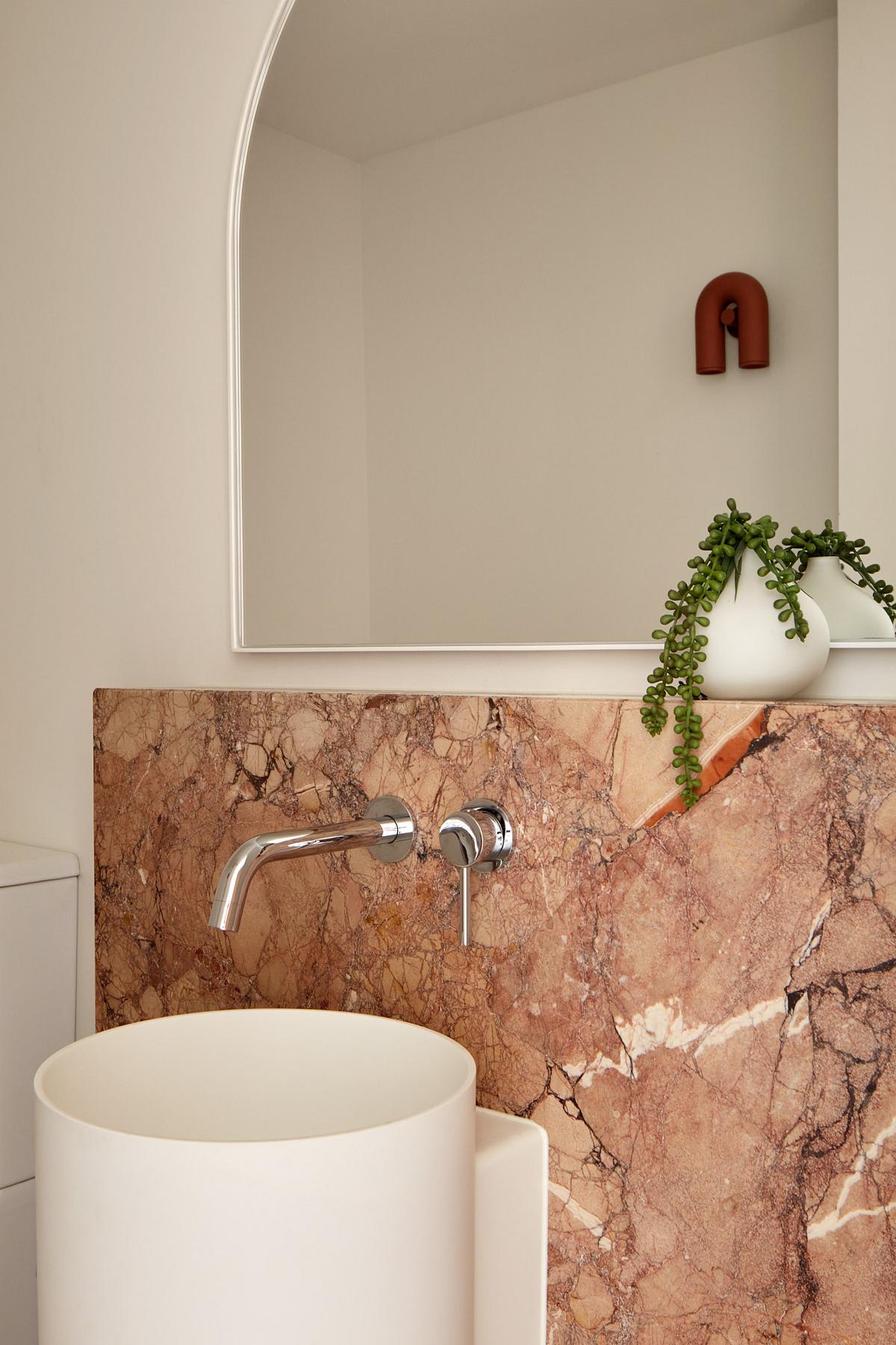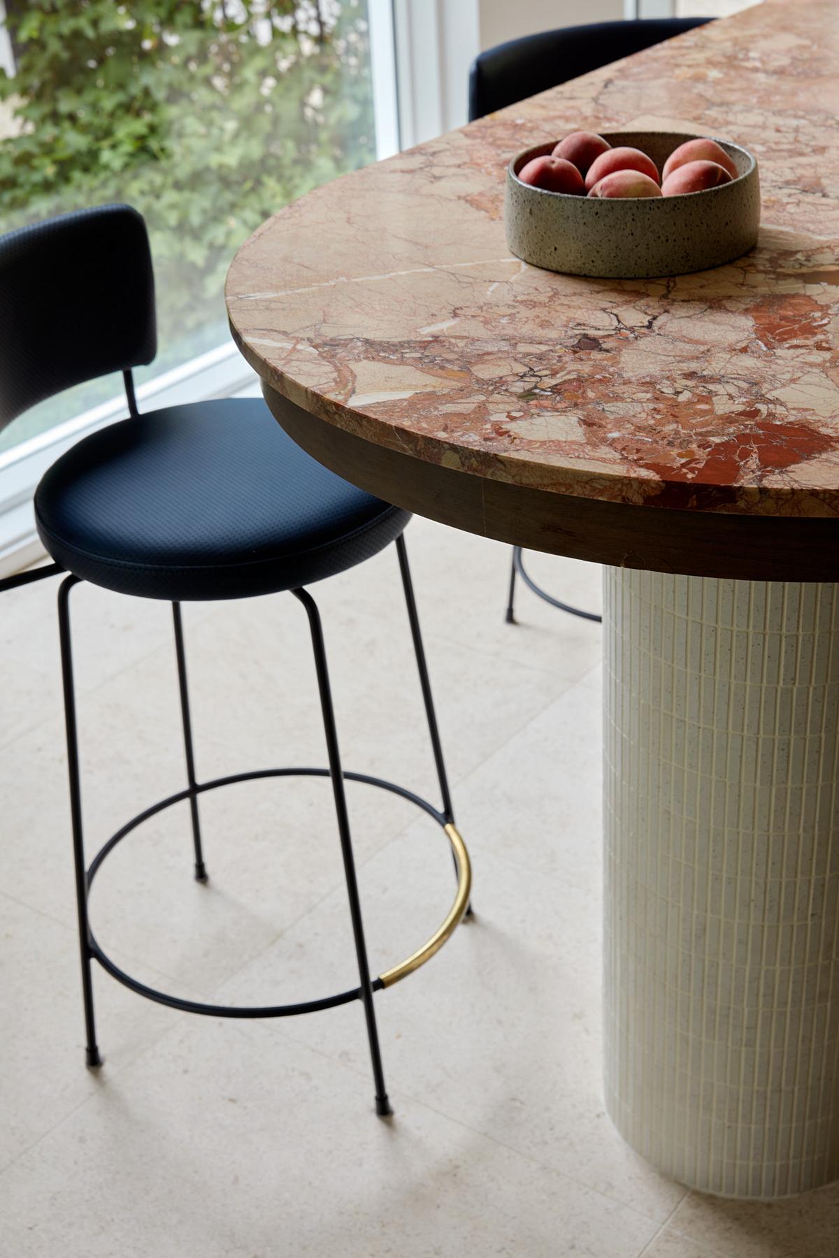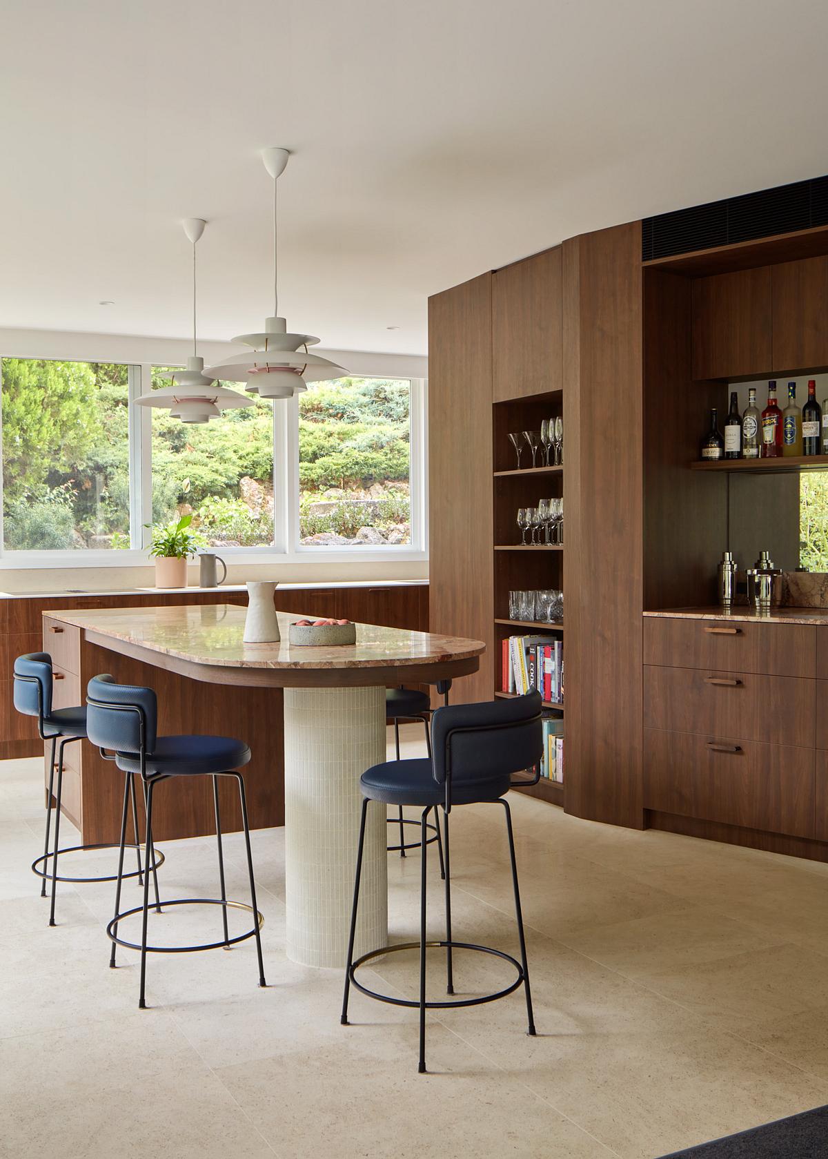 The design process began almost like an archaeological exercise. Demolition works revealed fragments of the original material palette, offering clues about the home’s past. Among the most interesting discoveries was pink marble dating back to the 1950s, a material that once played a central role in the house. The design team placed it at the heart of the new interiors. Paired with walnut cabinetry that references a later 1970s refurbishment, the marble helps bridge two moments in the home’s history.