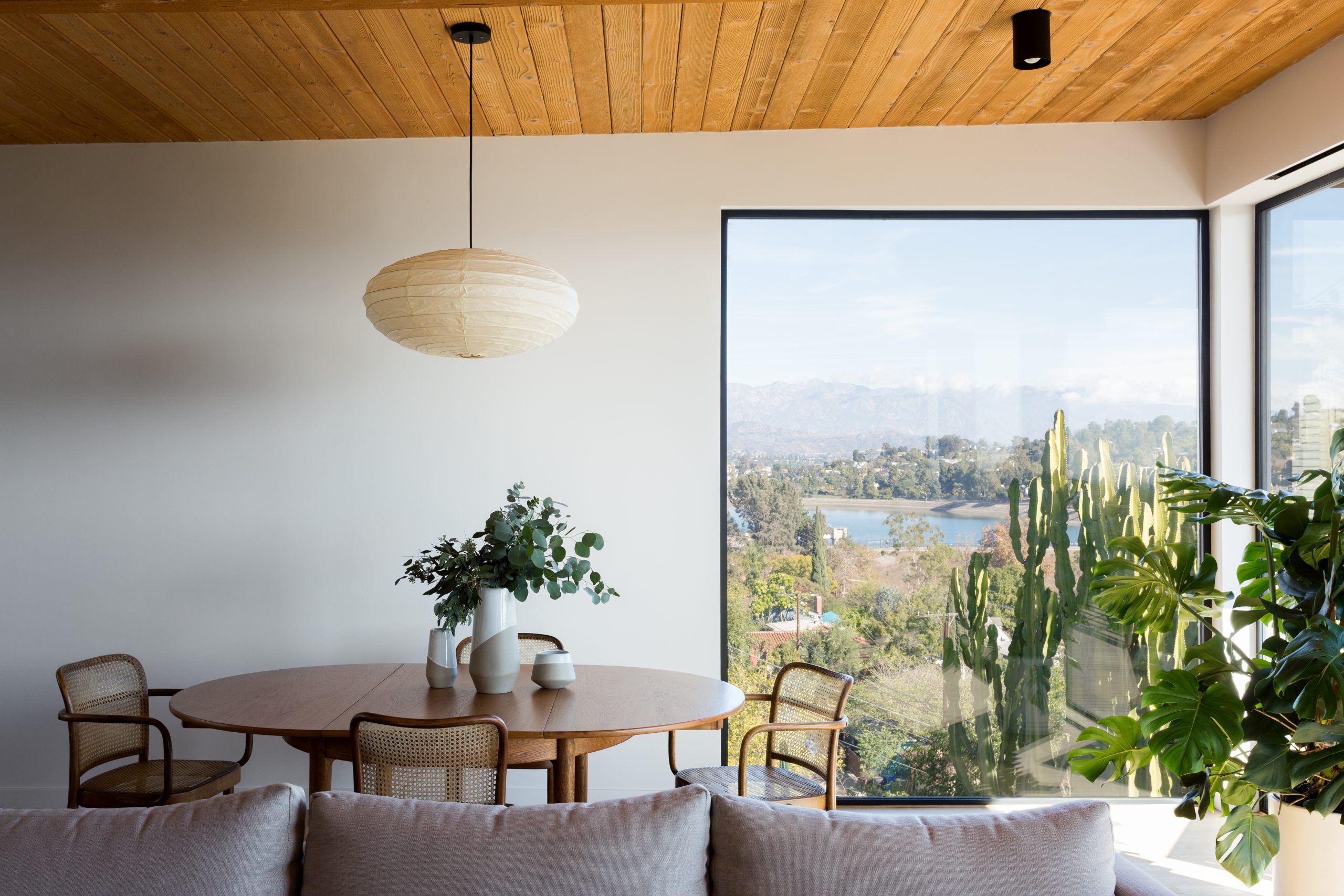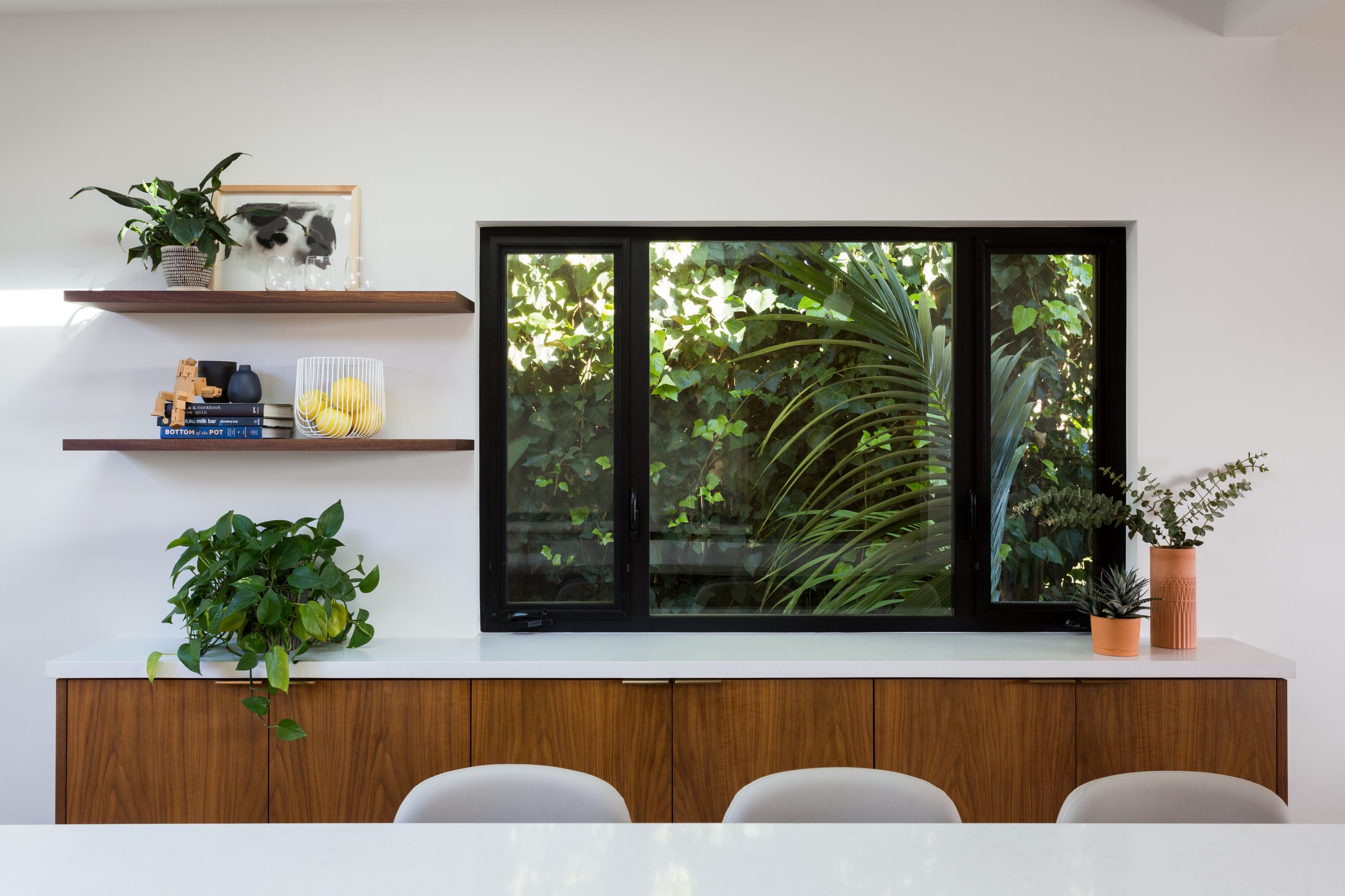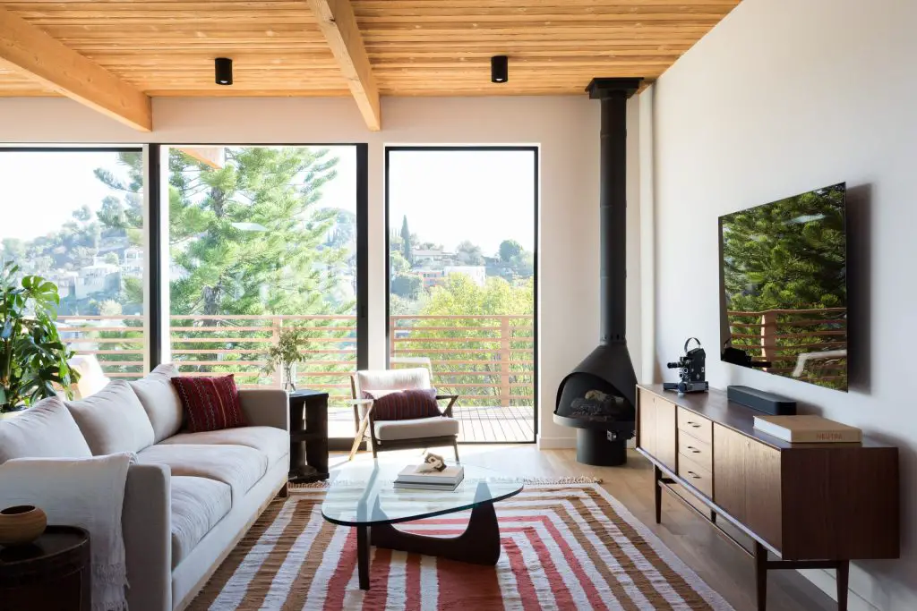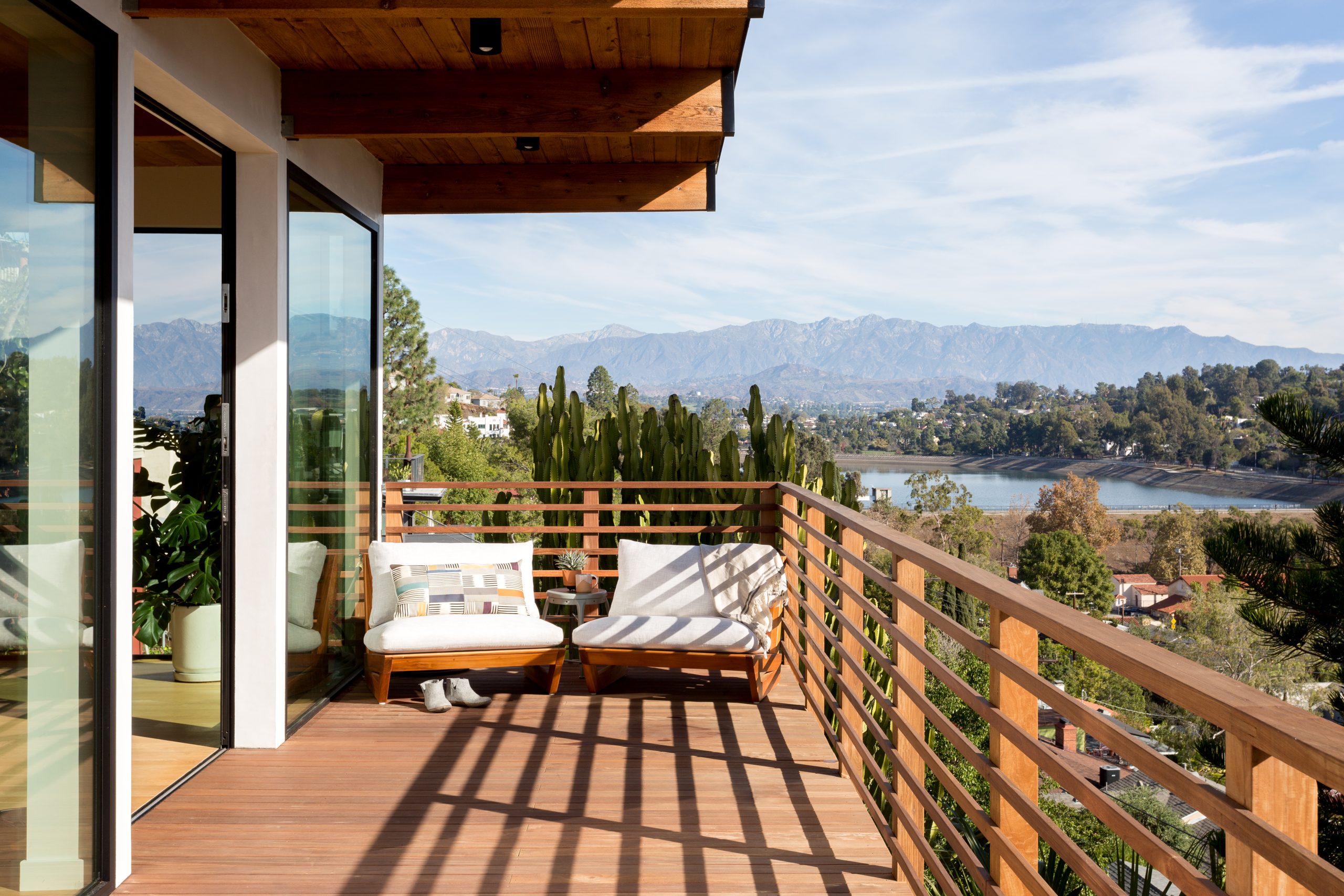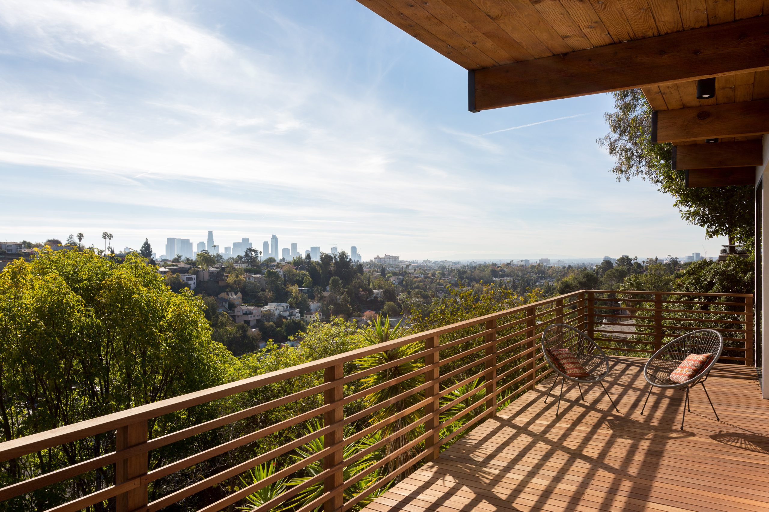 At the rear, this approach becomes most visible. The deck has been rebuilt in Ipe wood, extending the living space outward and framing views toward the Silver Lake Reservoir. Fleetwood sliding doors allow the interior to open directly onto this space, creating a clear link between inside and out. When open, the transition is almost continuous, with the deck functioning as an extension of the main living area.