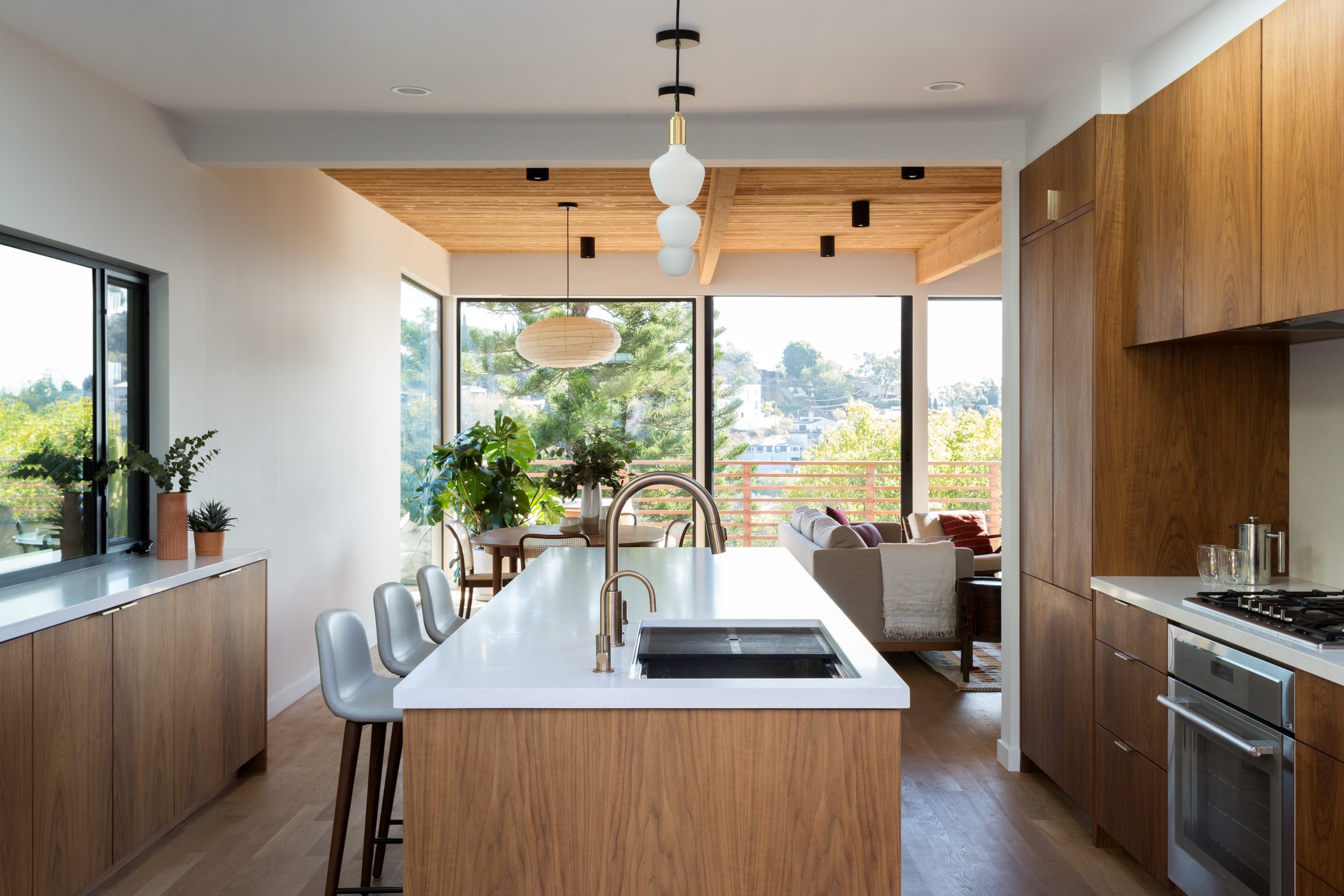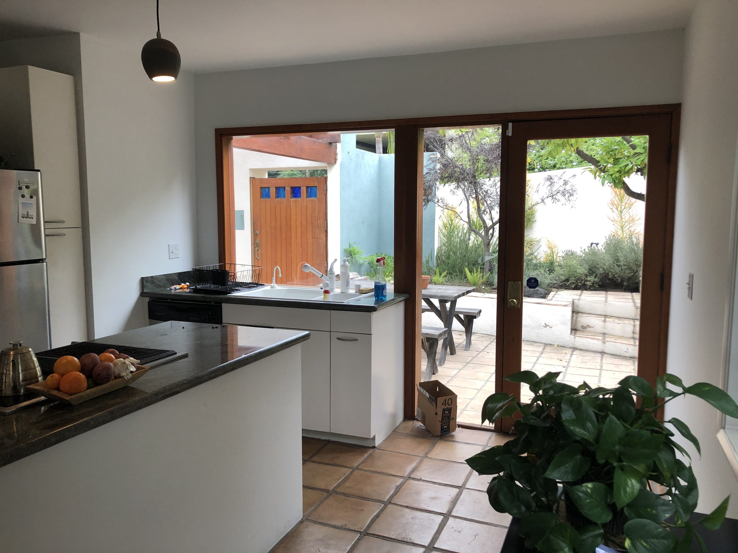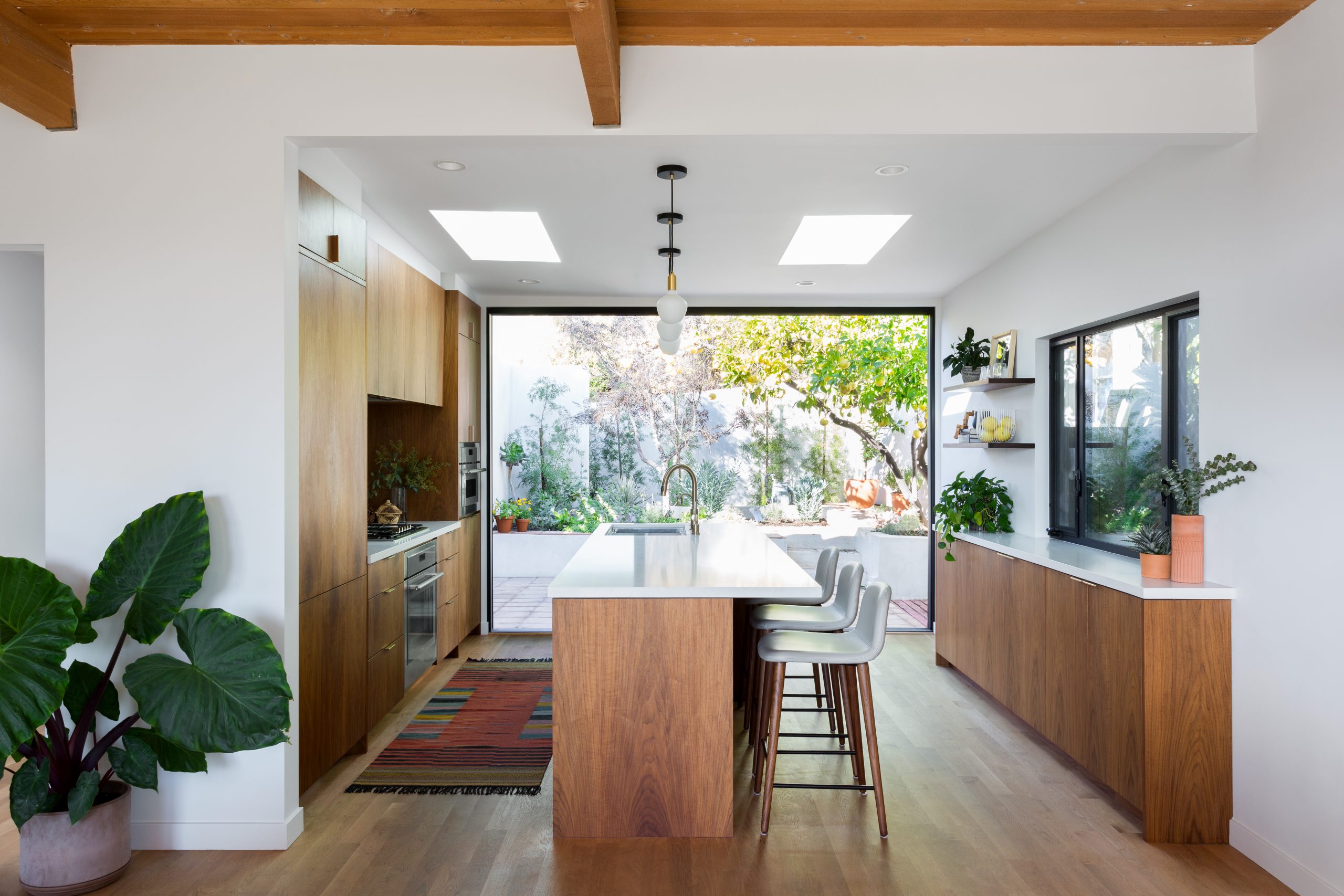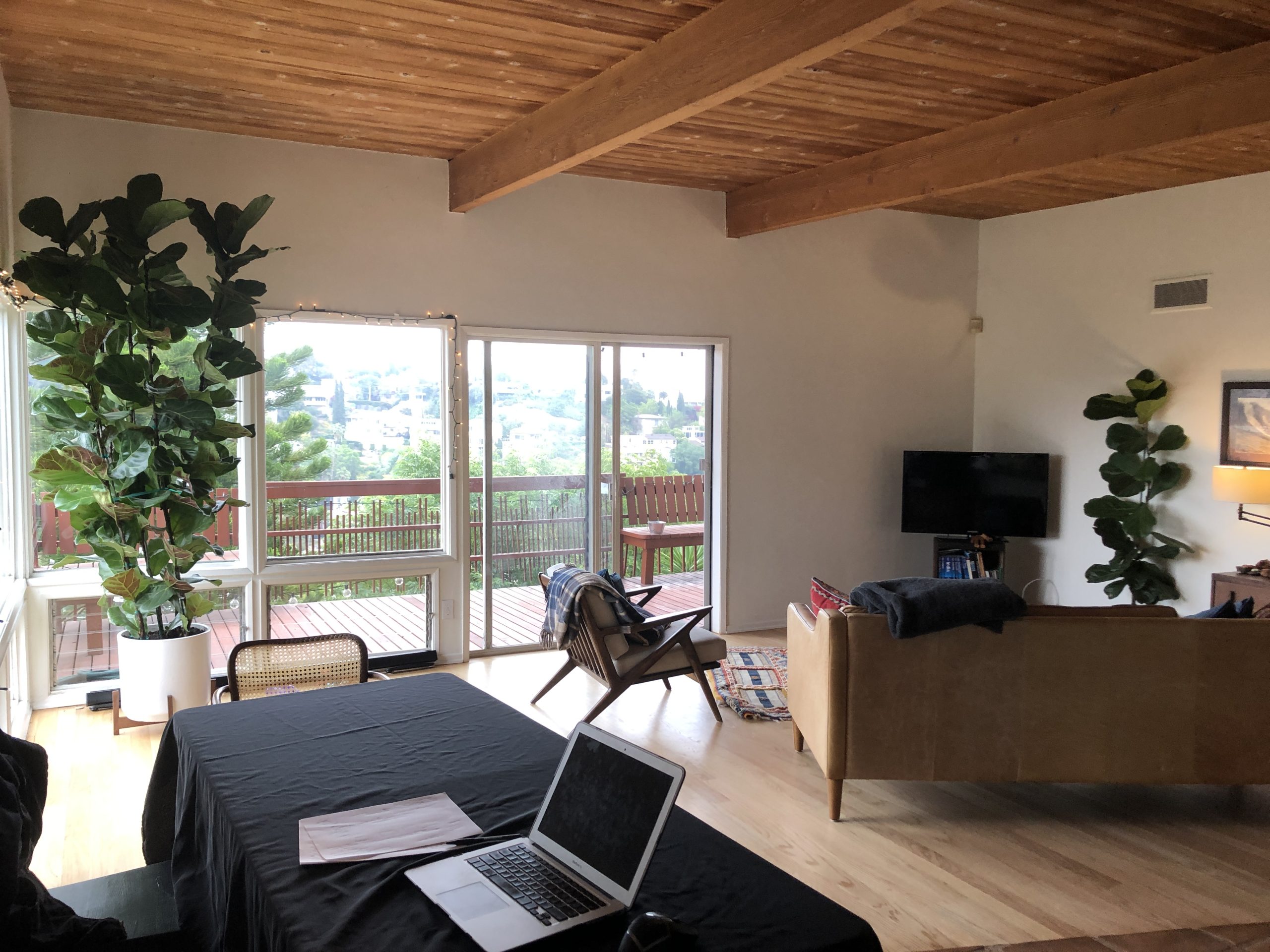 At the rear, this approach becomes most visible. The deck has been rebuilt in Ipe wood, extending the living space outward and framing views toward the Silver Lake Reservoir. Fleetwood sliding doors allow the interior to open directly onto this space, creating a clear link between inside and out. When open, the transition is almost continuous, with the deck functioning as an extension of the main living area.