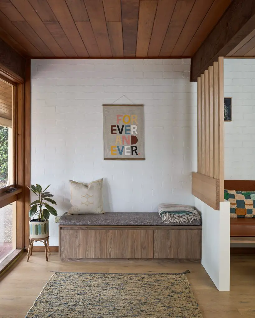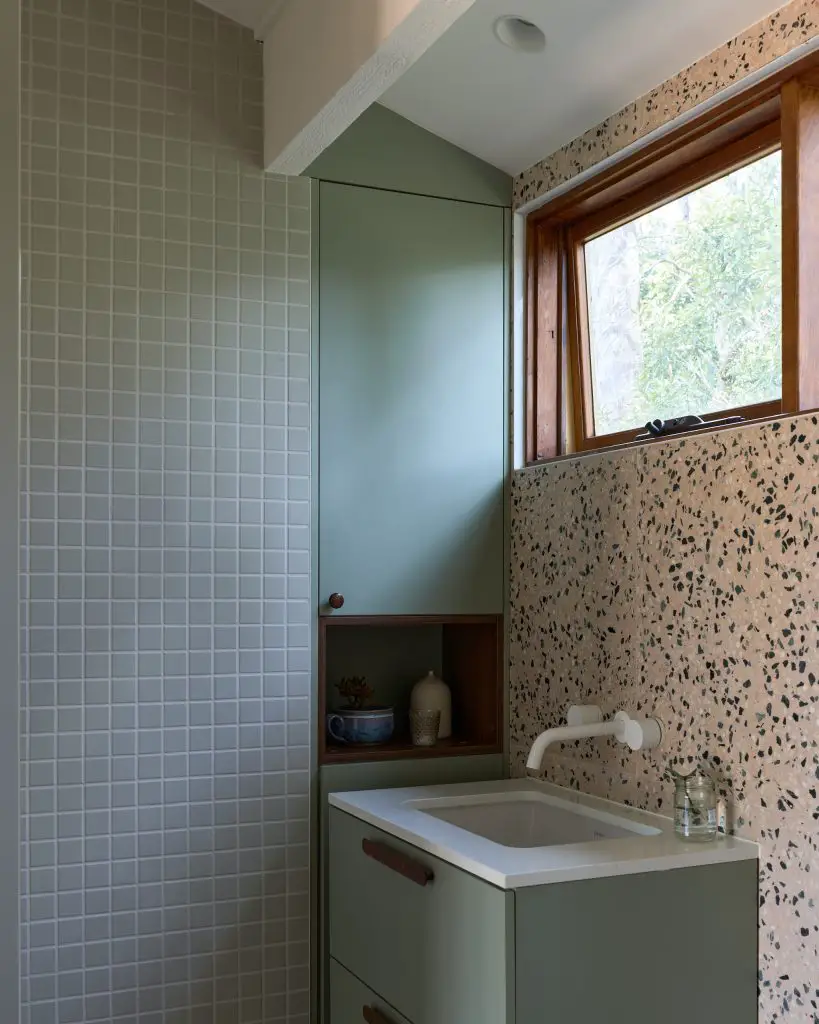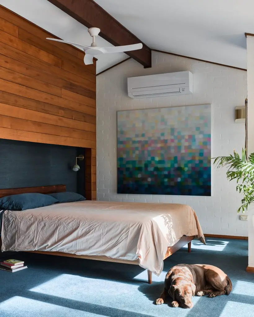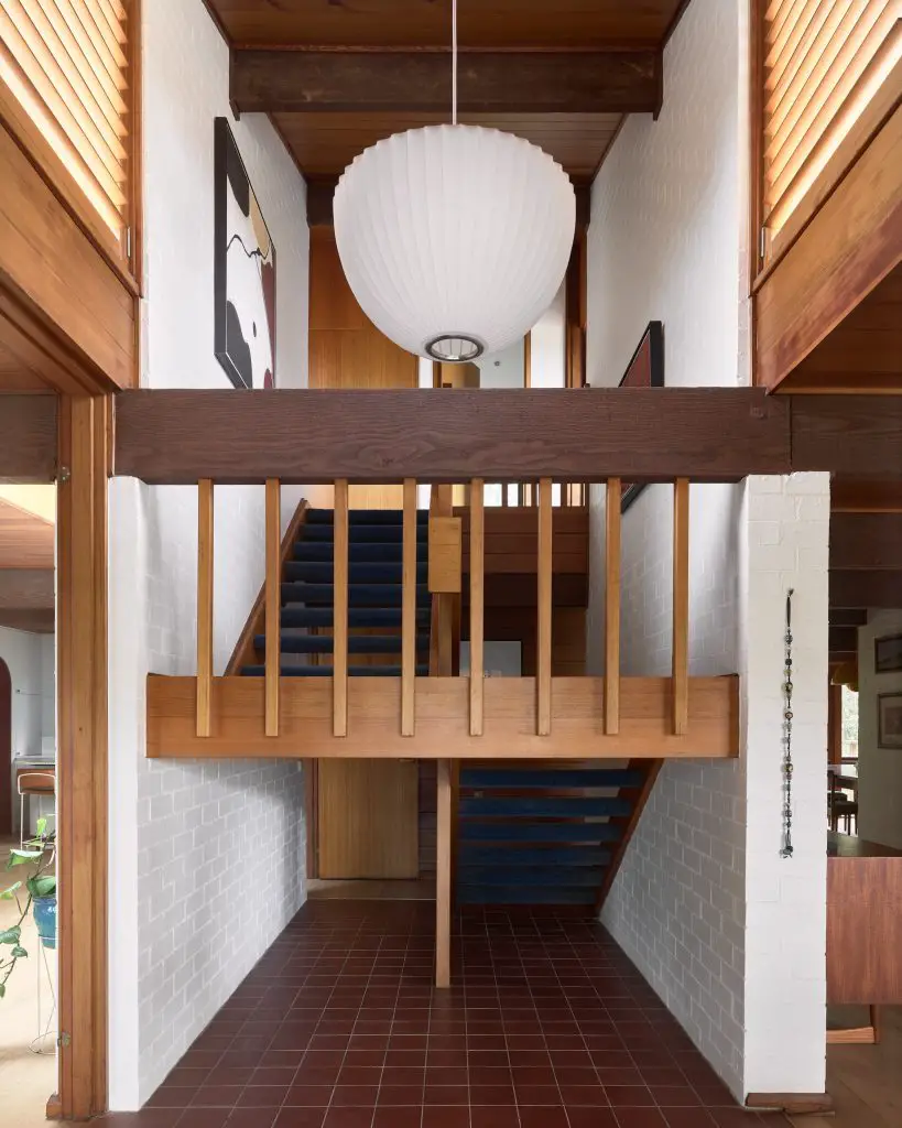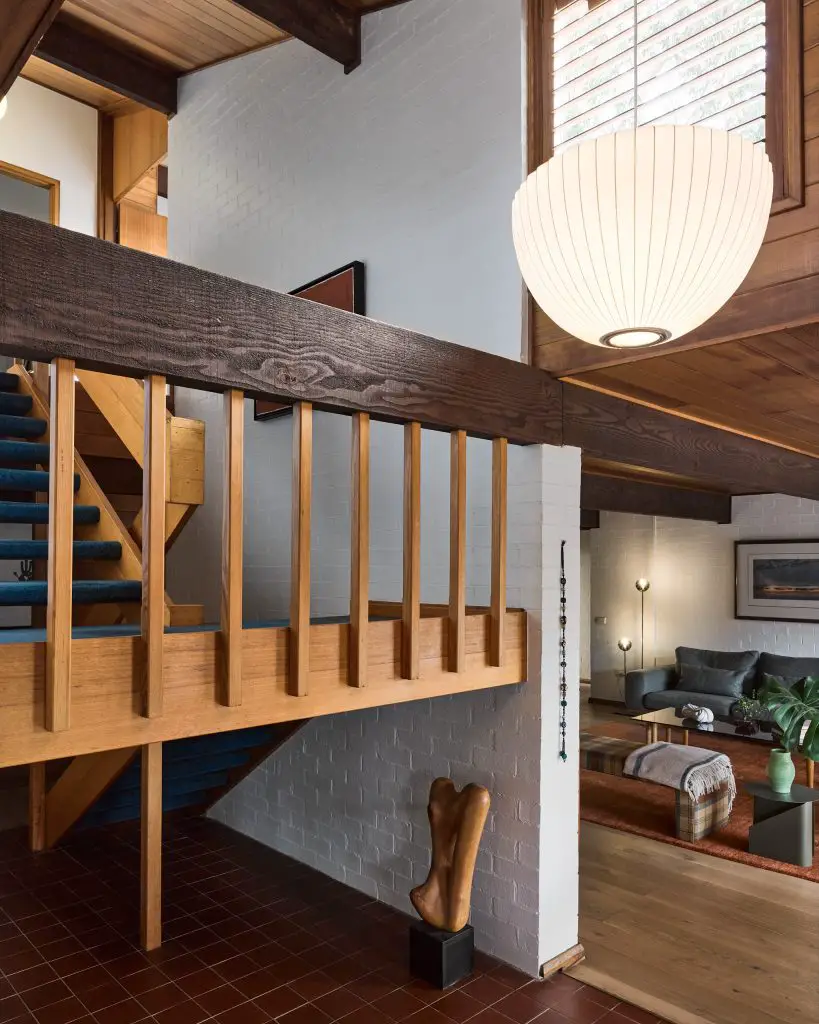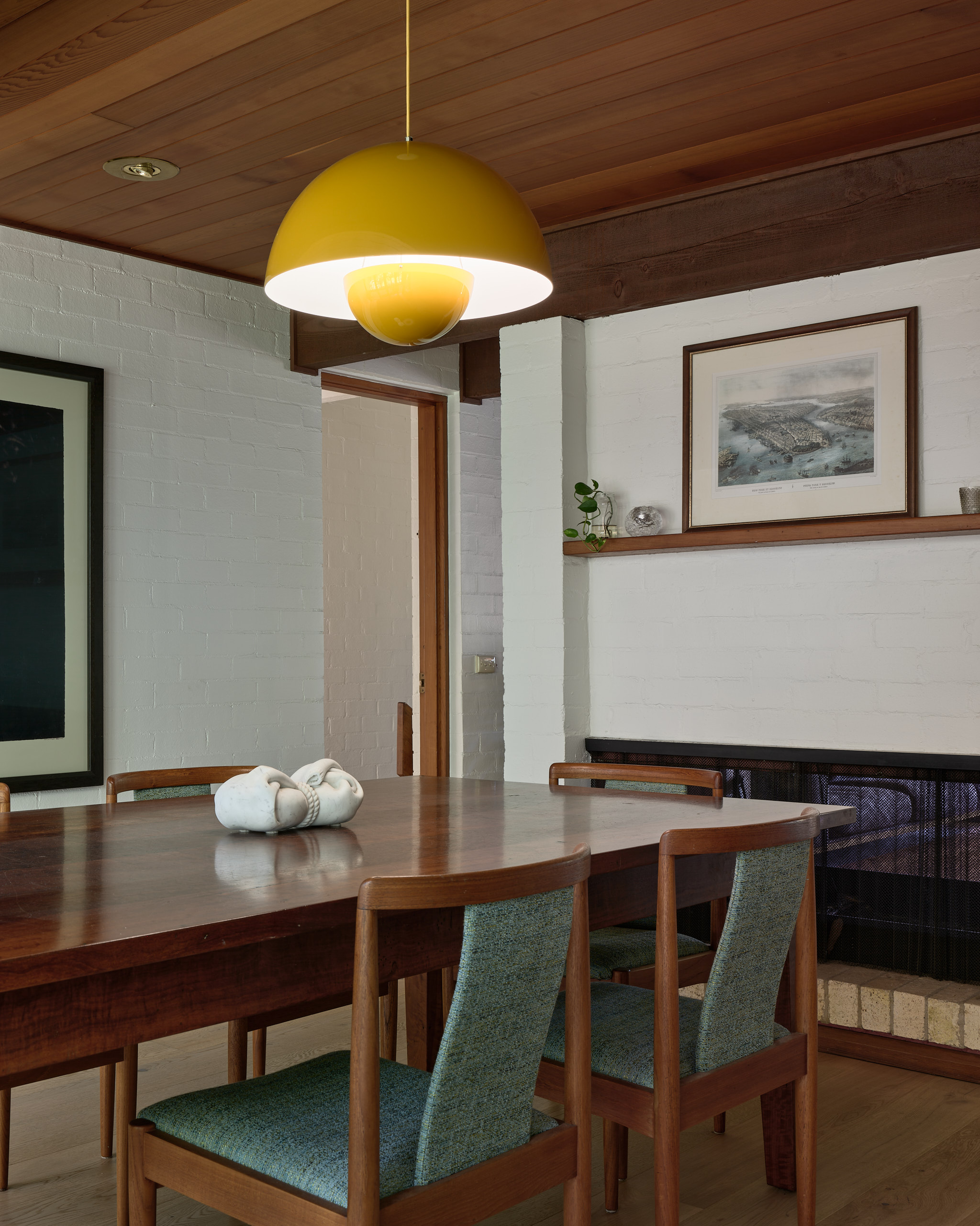 What followed was a refresh rather than a renovation. The existing structure stayed as it was. Instead, the focus was on layering in a palette of warm mid-century tones – orange, green, brown – with some blue and yellow to lift the mood. These choices sat easily alongside the original red cedar ceilings and terracotta tiles.