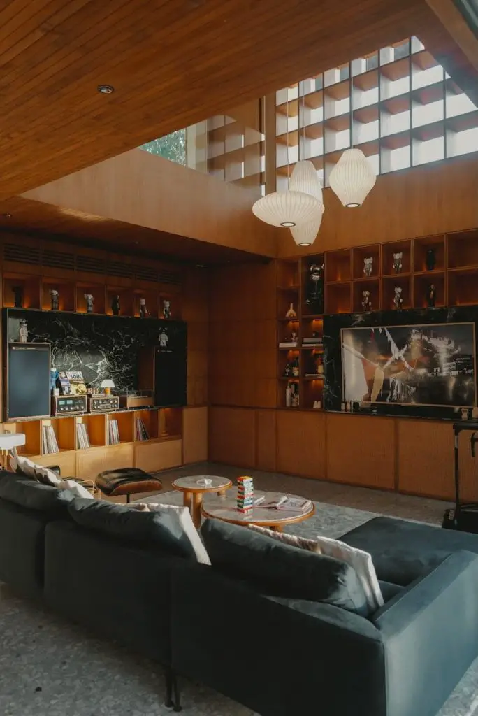 Materials reflected this same thinking. Timber, brick, stone, and glass were used in their natural state. Built-ins and cabinetry supported the structure, reducing clutter and keeping rooms orderly. Modular shelving and low, horizontal furniture reinforced the sense of flow and proportion, while simple pendant lighting helped define areas without adding weight. Whether a custom design or a standard build, the goal was the same: make the home work well without feeling complex.
